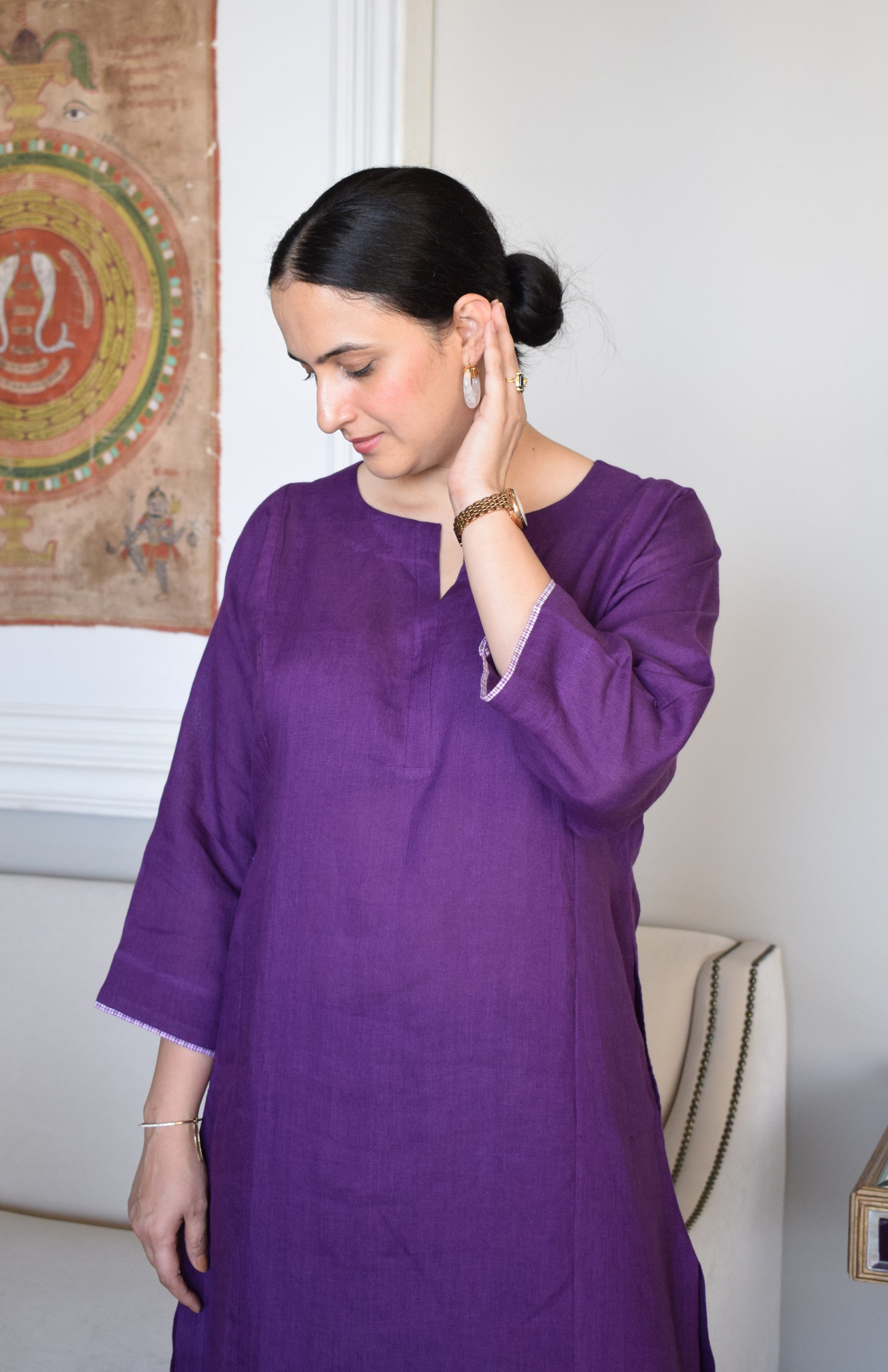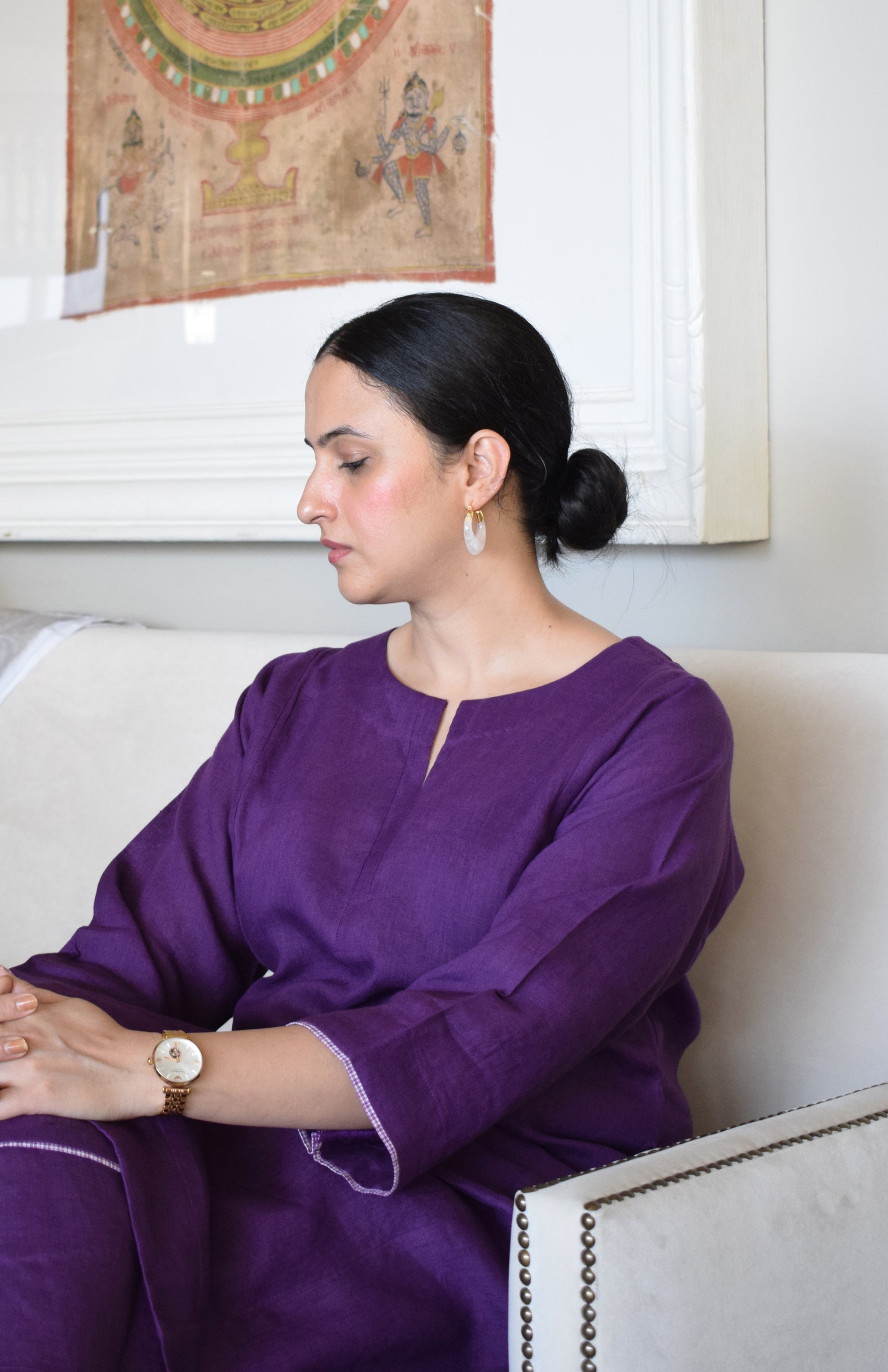 Our Purple linen straight fit paneled kurta can easily be styled with our purple linen balloon fit trousers for a monochromatic look. You can keep the look minimalistic with a sleek watch and simple earrings.
