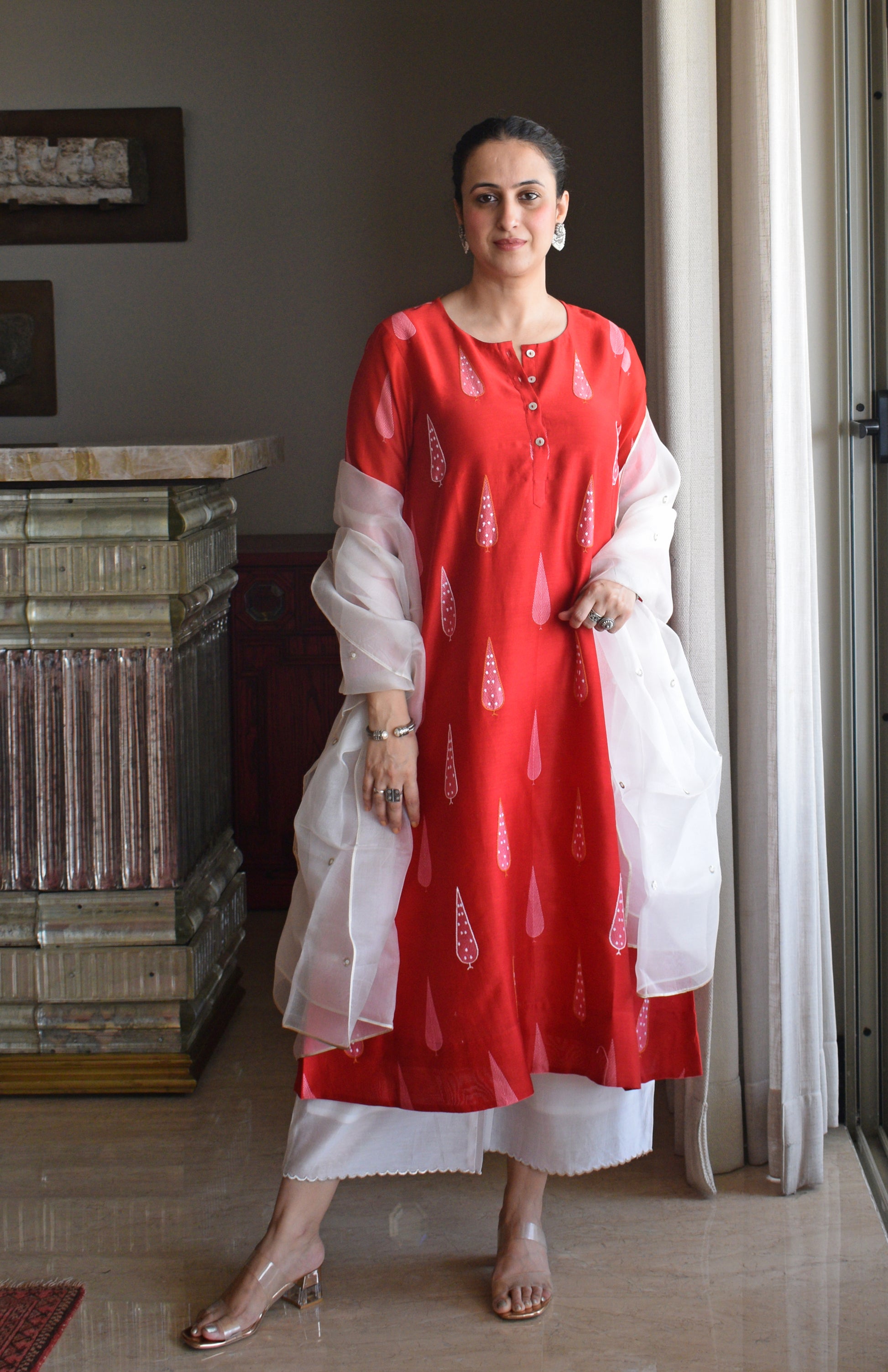 Red Chanderi Kurta with Off White Chanderi Scallop Pyjama