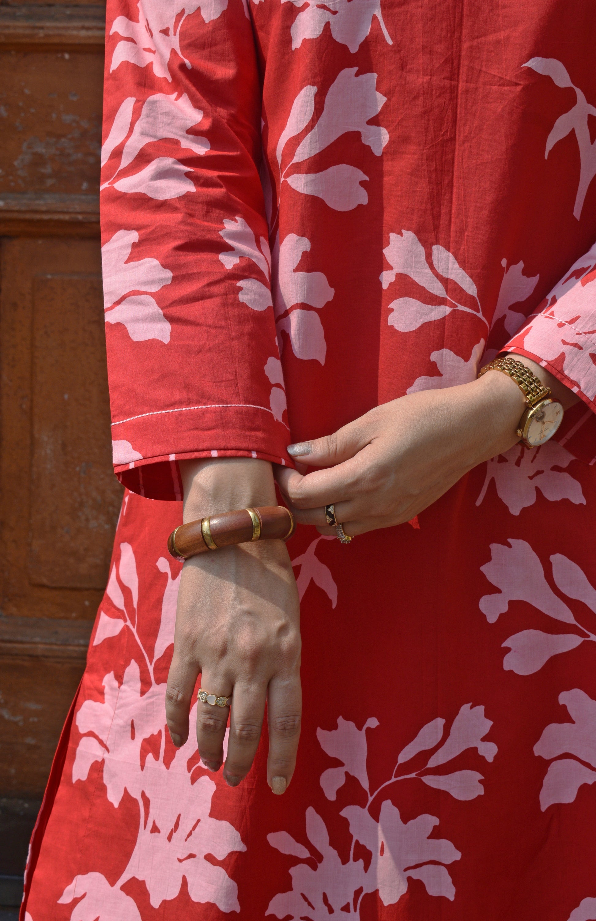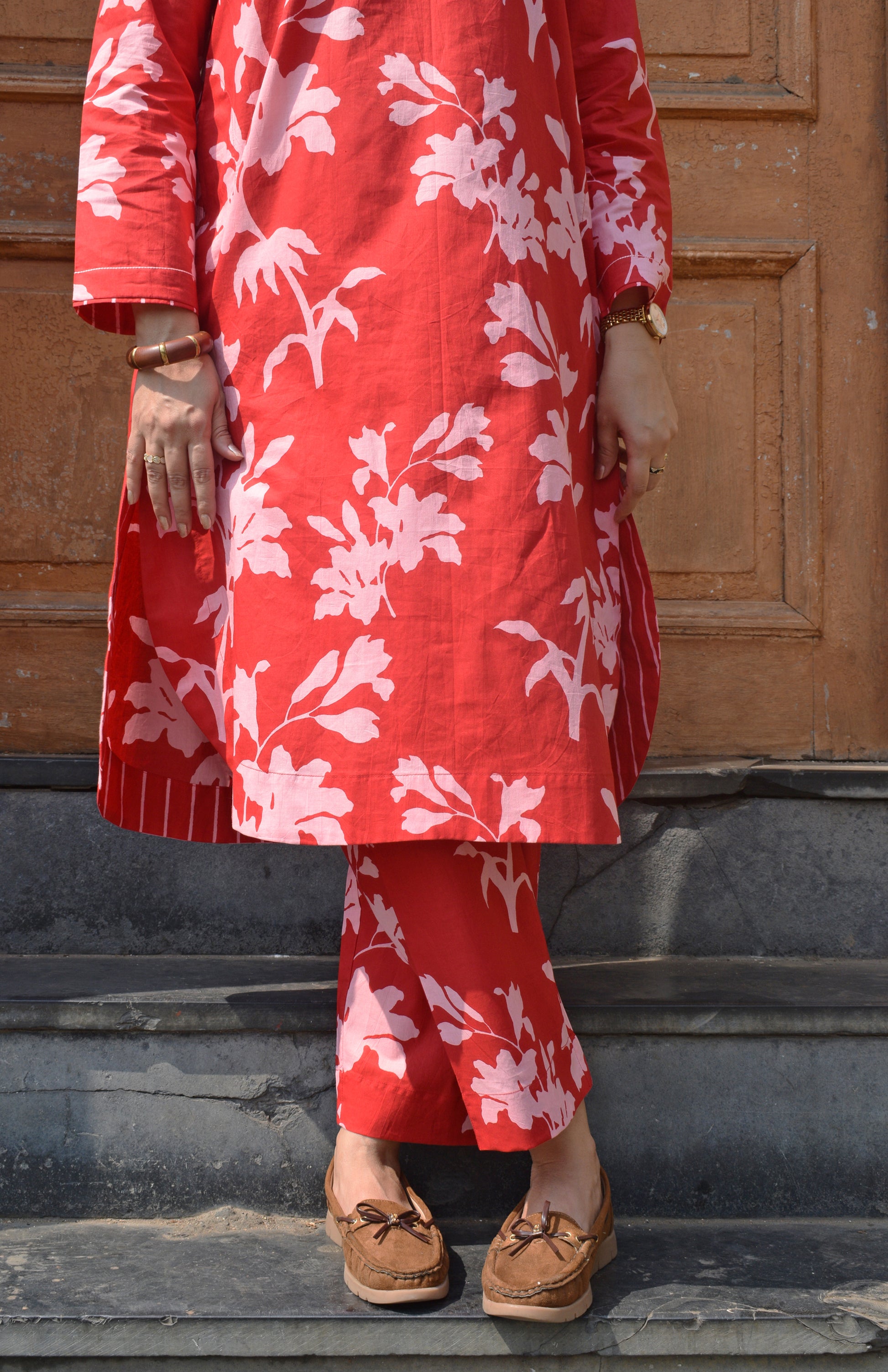 Coral Stripe Bias Paneled kurta in Handwoven cotton