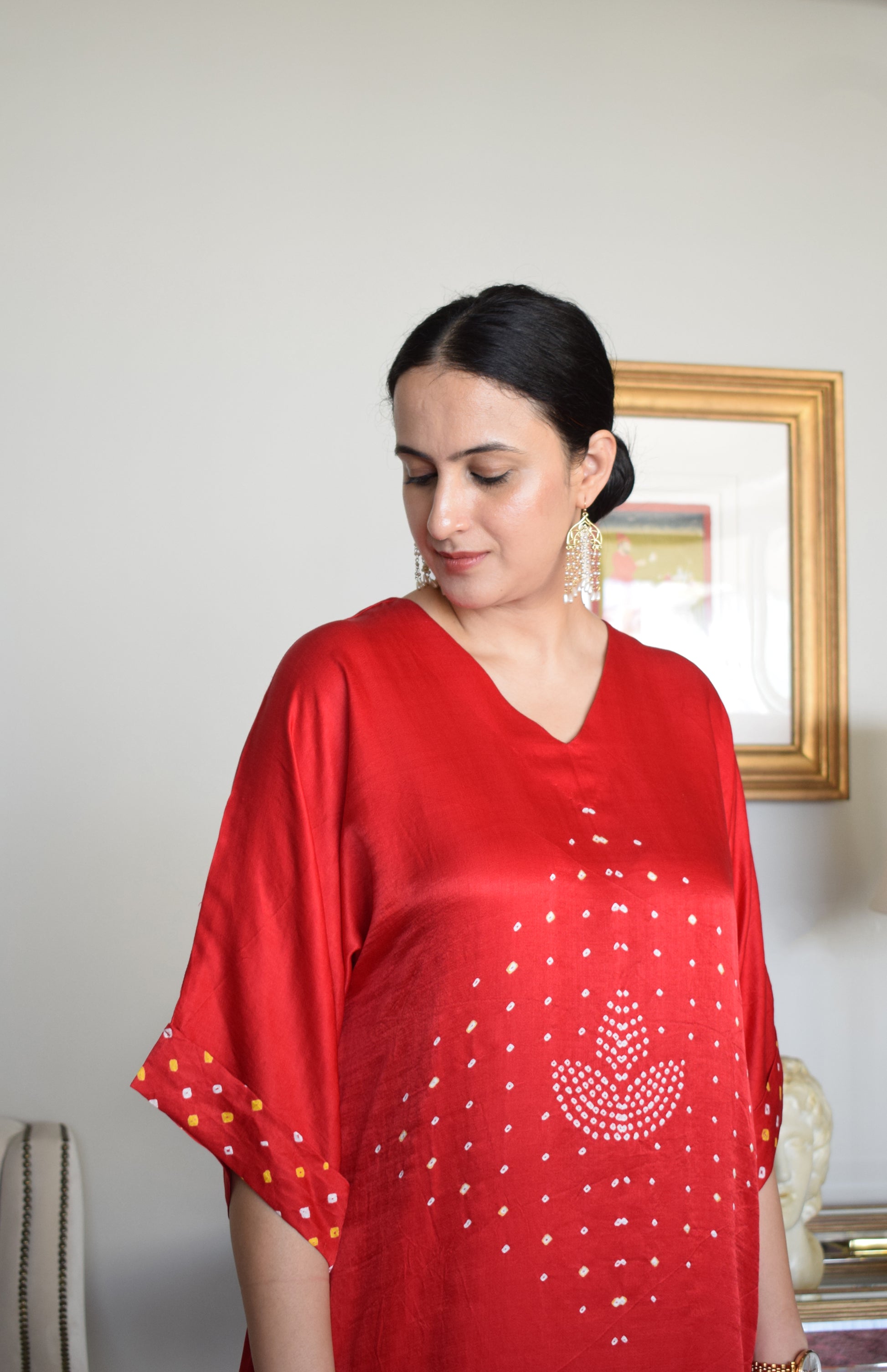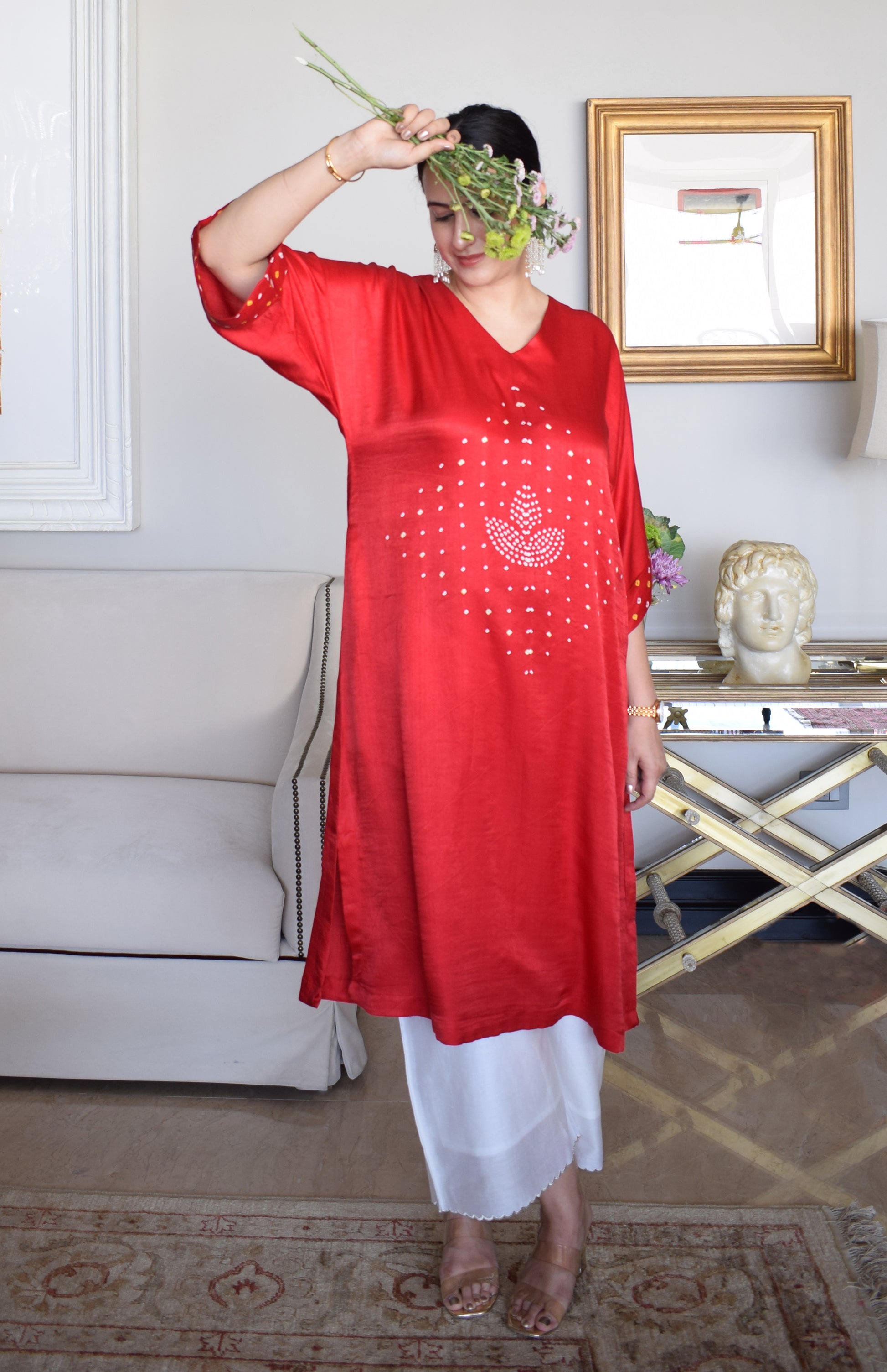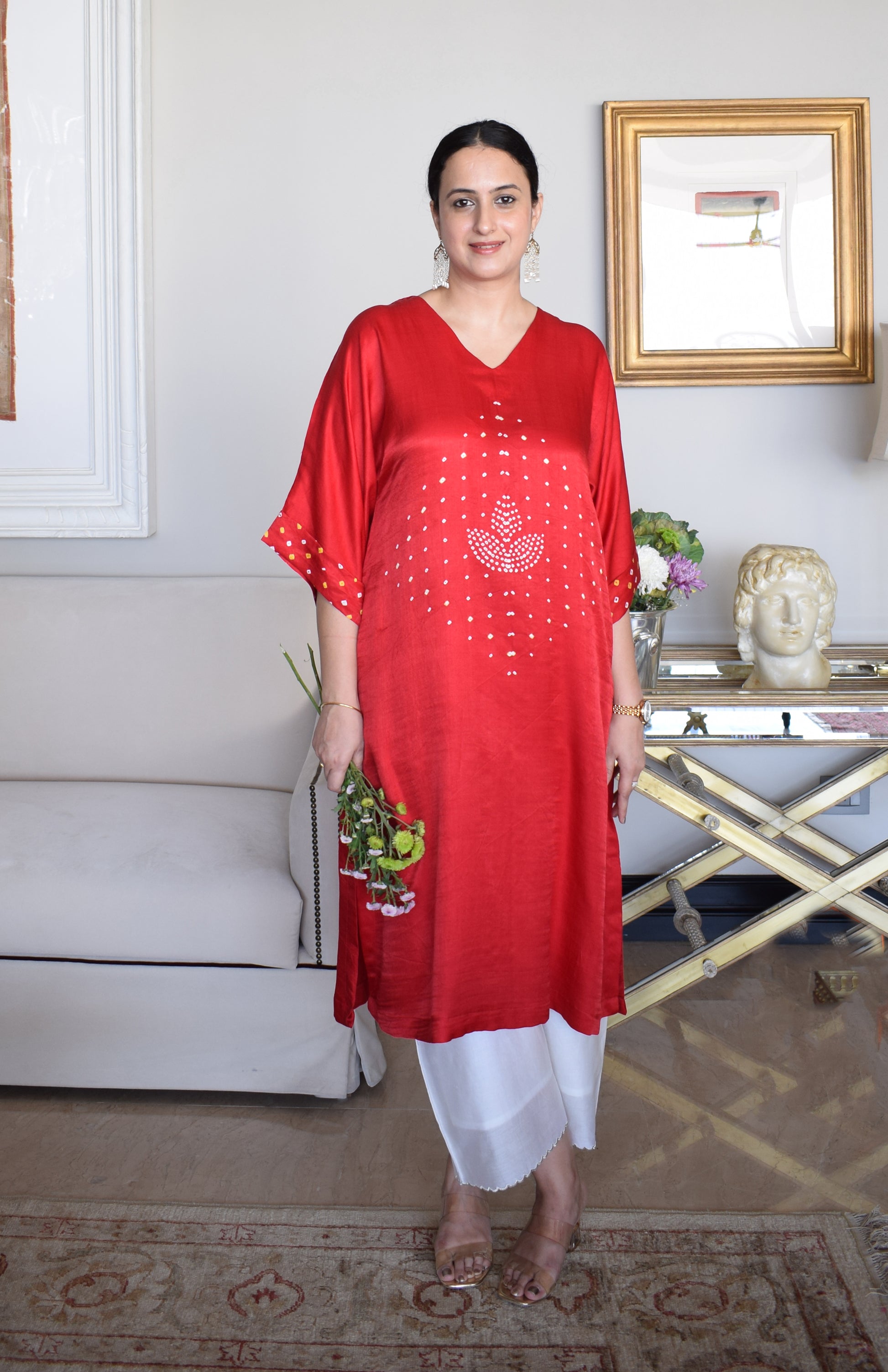Our Red Gaji Silk Kurta with Bandhej can easily be styled with off white pyjama, jutis or heels. Pair it with gold jewelry to elevate the look for festive occasions.