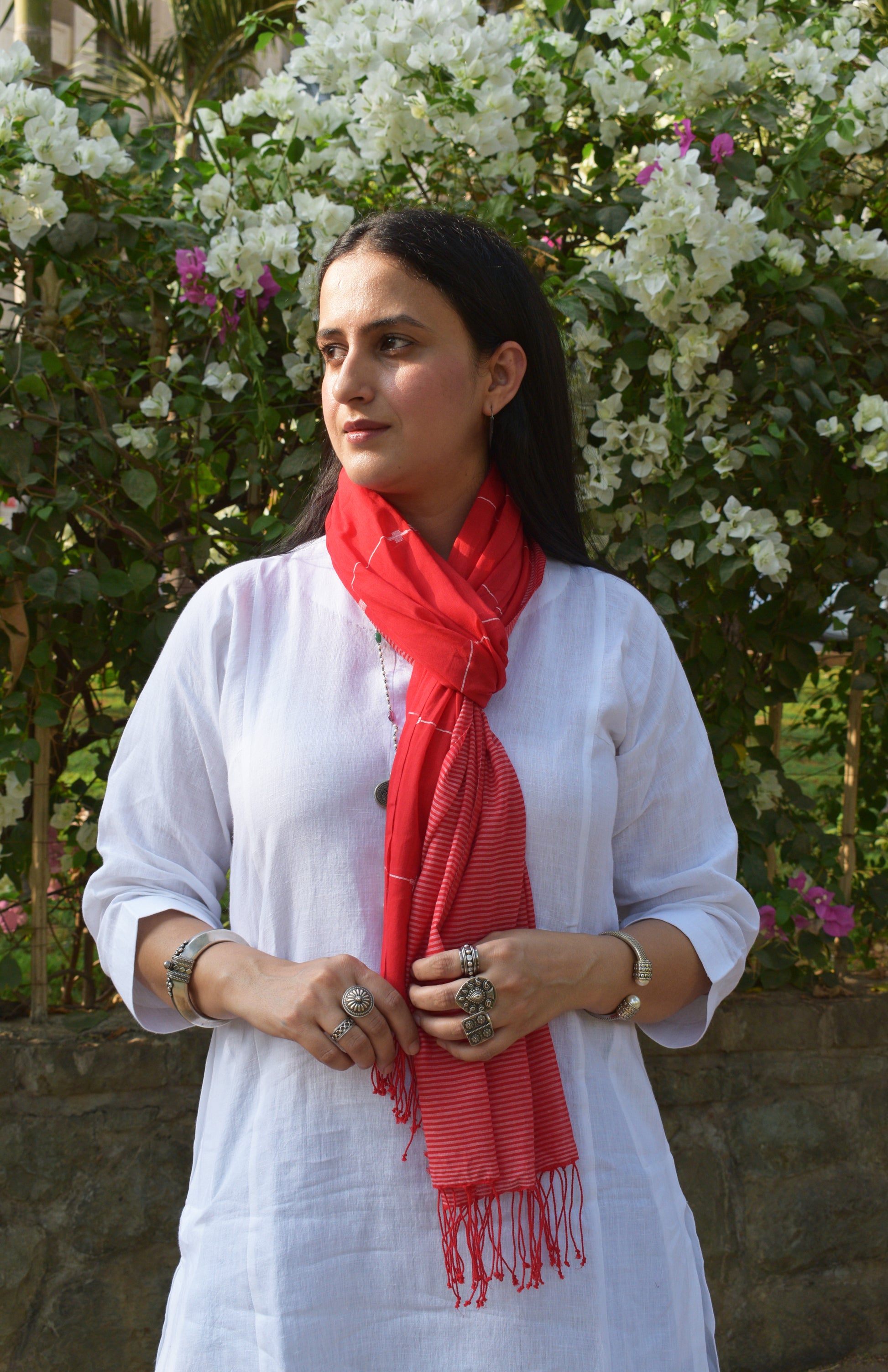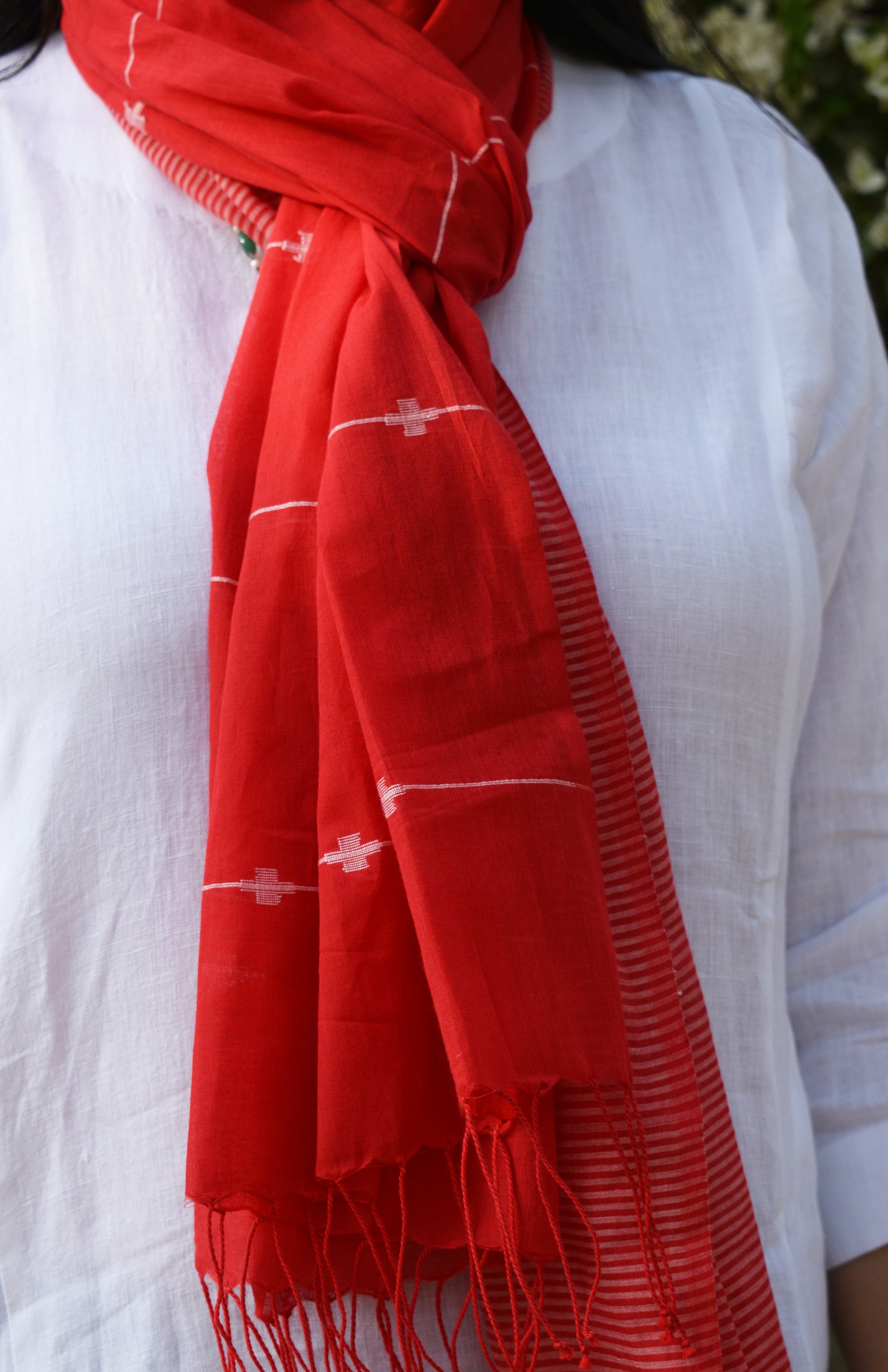 Lightweight handwoven jamdani cotton stole with contrast traditional motifs and stripes This stole features handcrafted tasseled edge.