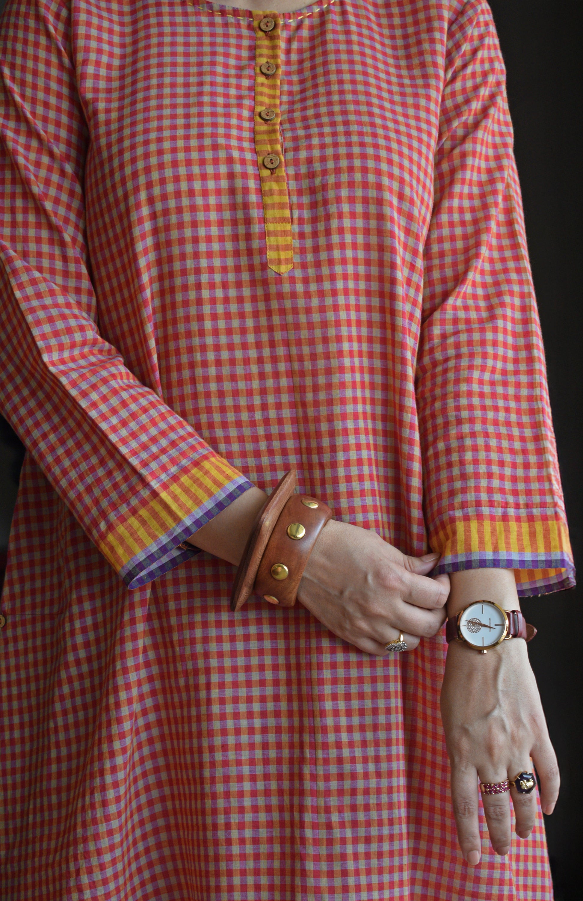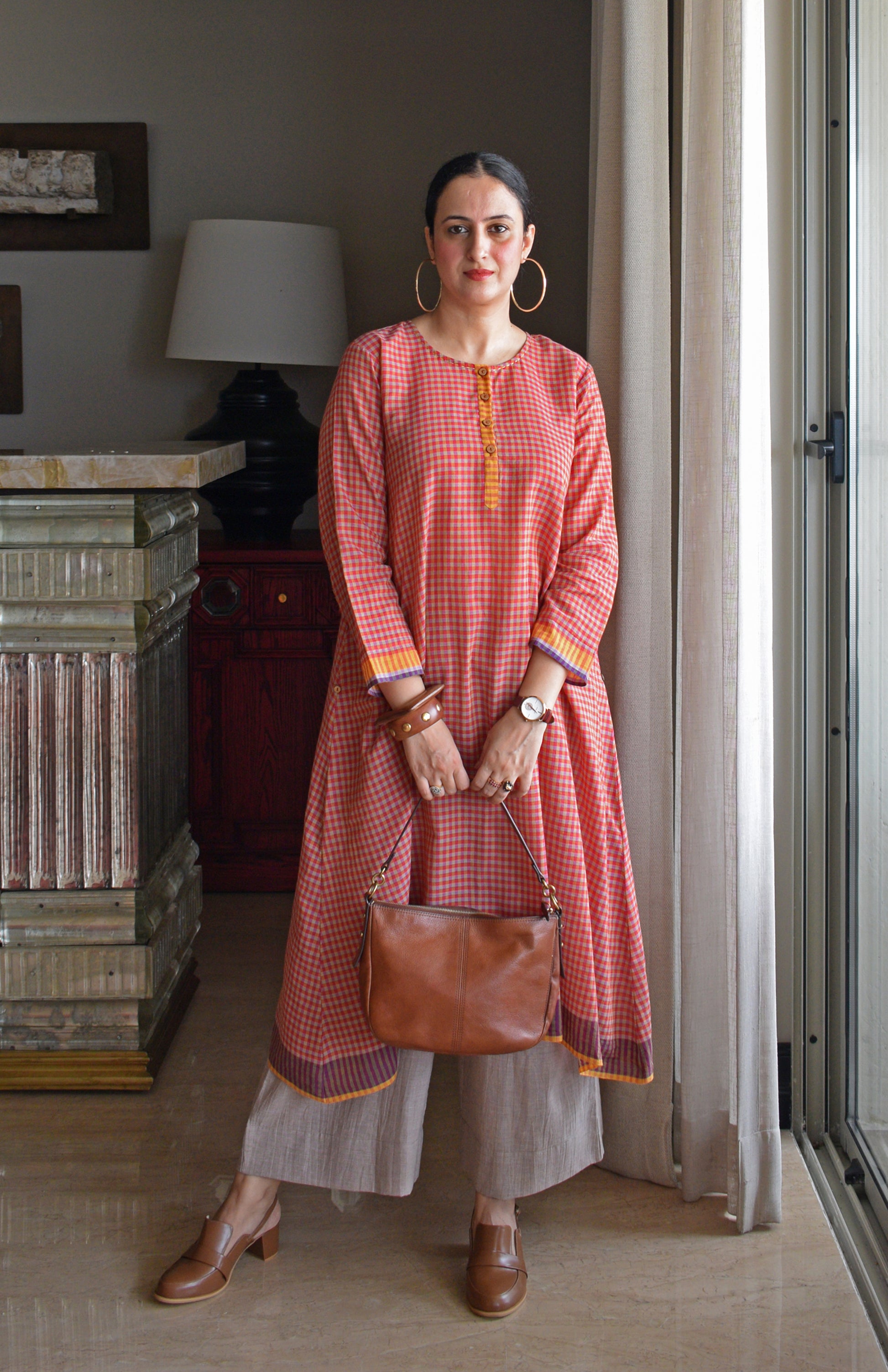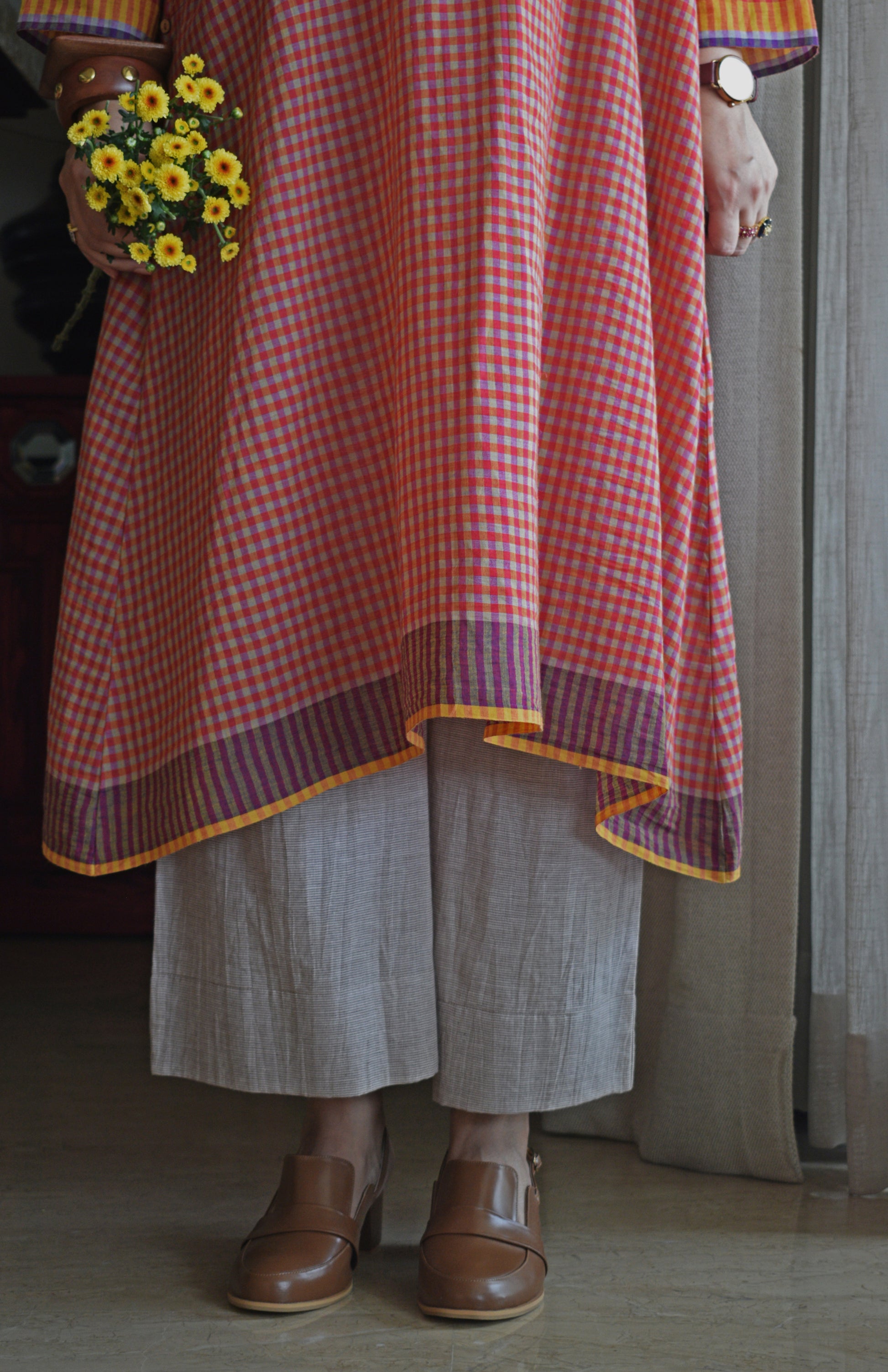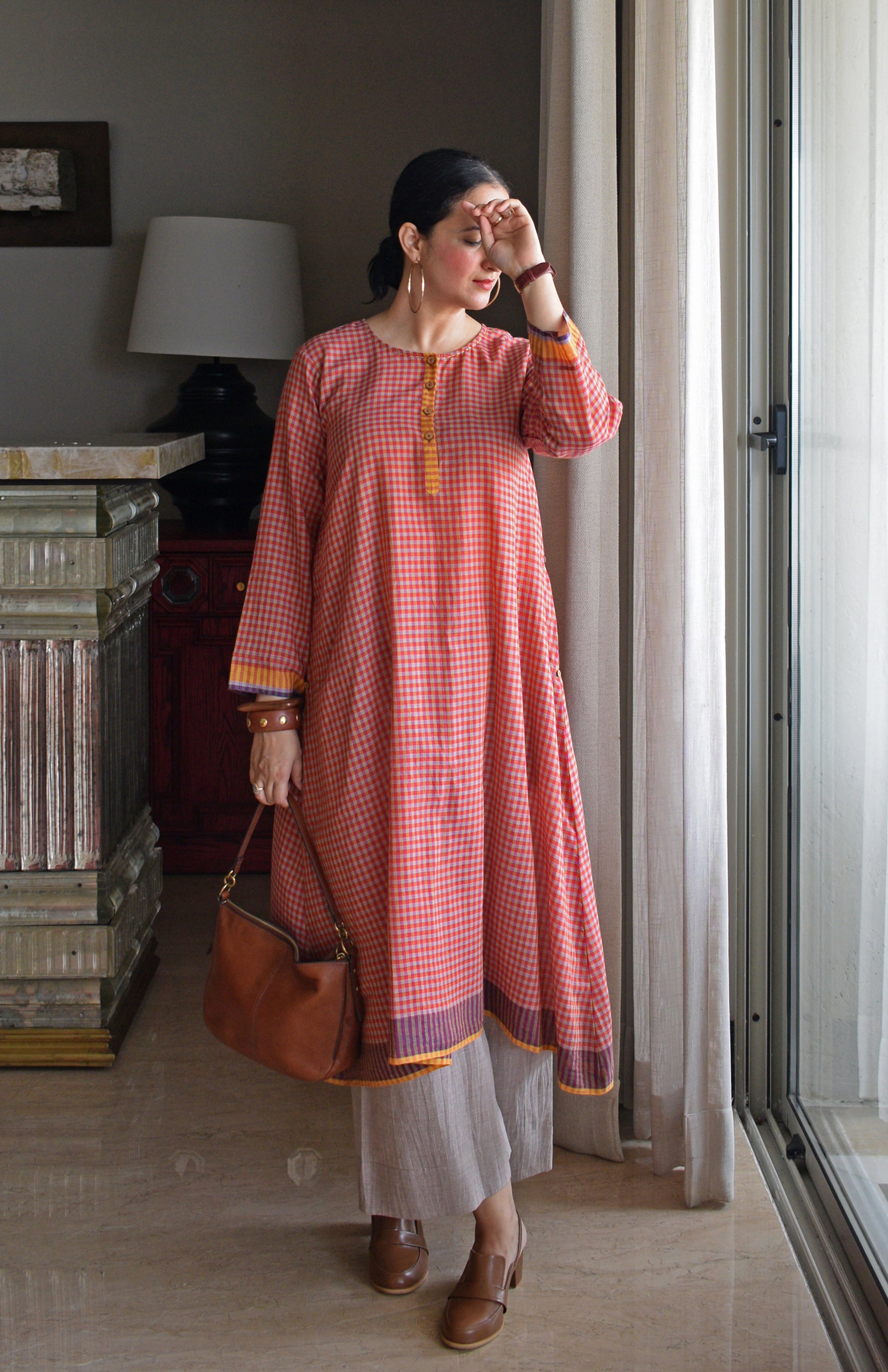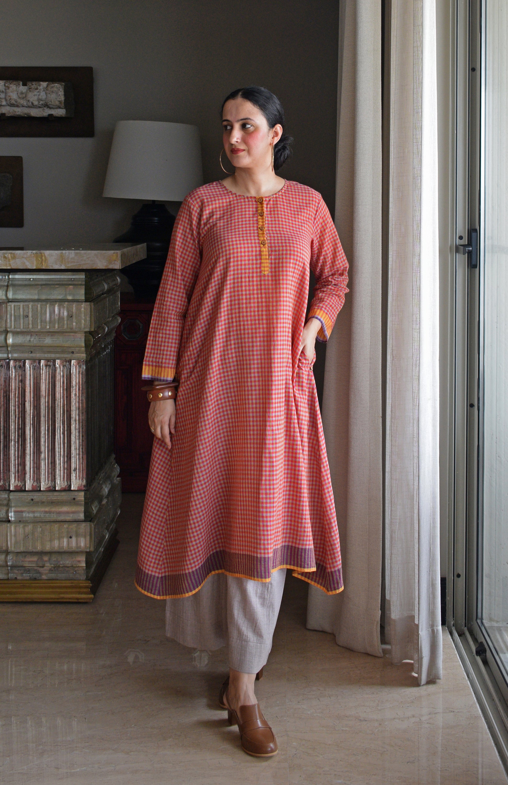 Rust Orange A line Kurta with Round Neck in Handwoven checks