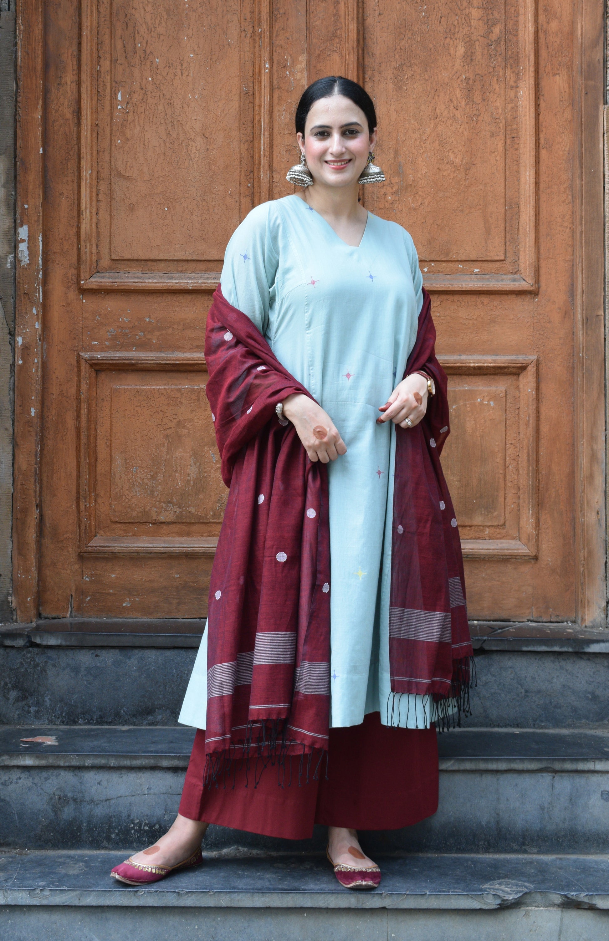 Loose-fitted Jamdani kurta stitched in phiran style with side panels and gusset. This kurta has no armhole. It is an A-line fit with pockets on both sides of the kurta. This kurta comes with a mul cotton slip and maroon pyjama with full elastic at the waistband