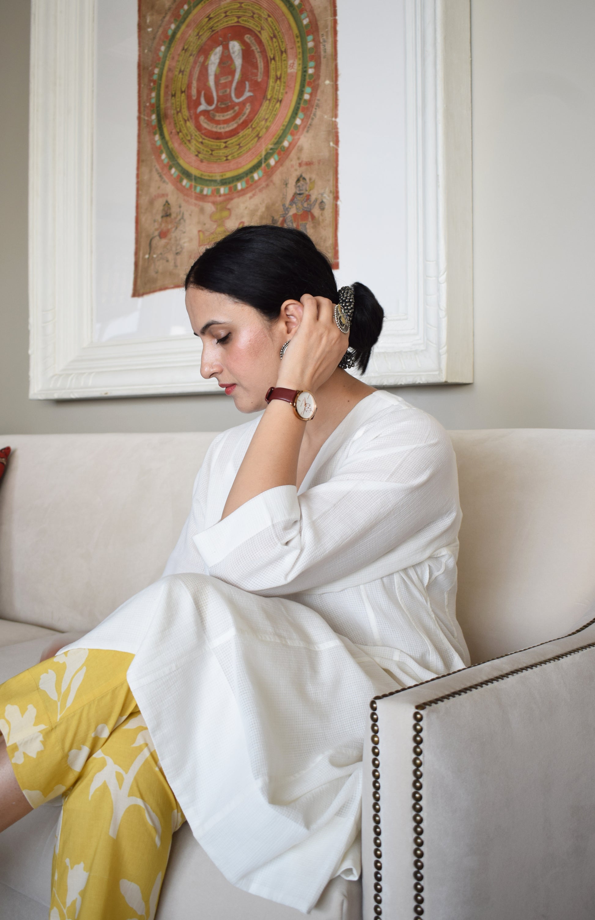 Loose-fitted kurta in handwoven checks cotton stitched in phiran style with side panels and gusset. This kurta has no armhole. It is an A-line fit with pockets on both sides of the kurta. This kurta comes with a mul cotton slip. This set includes a printed yellow floral straight fit pants with full elastic waistband