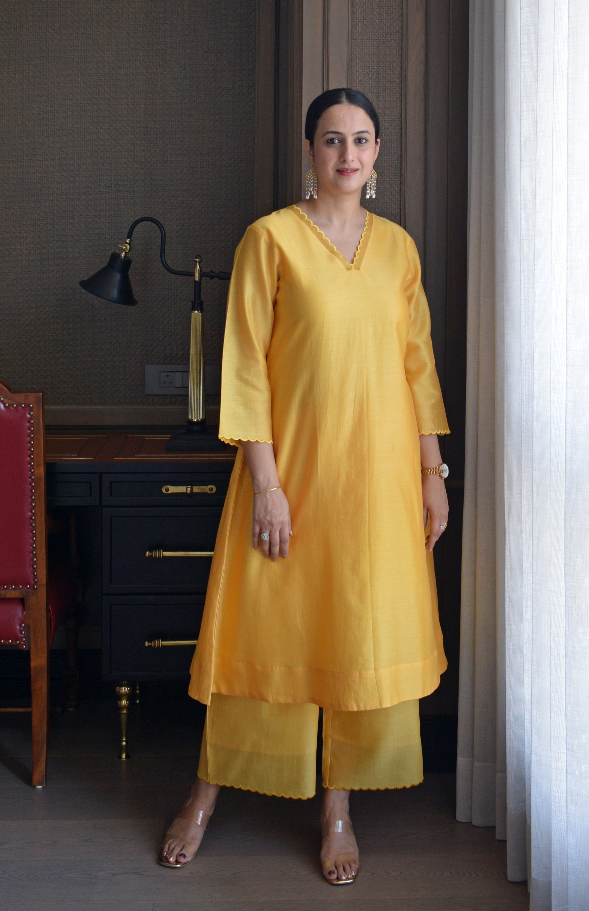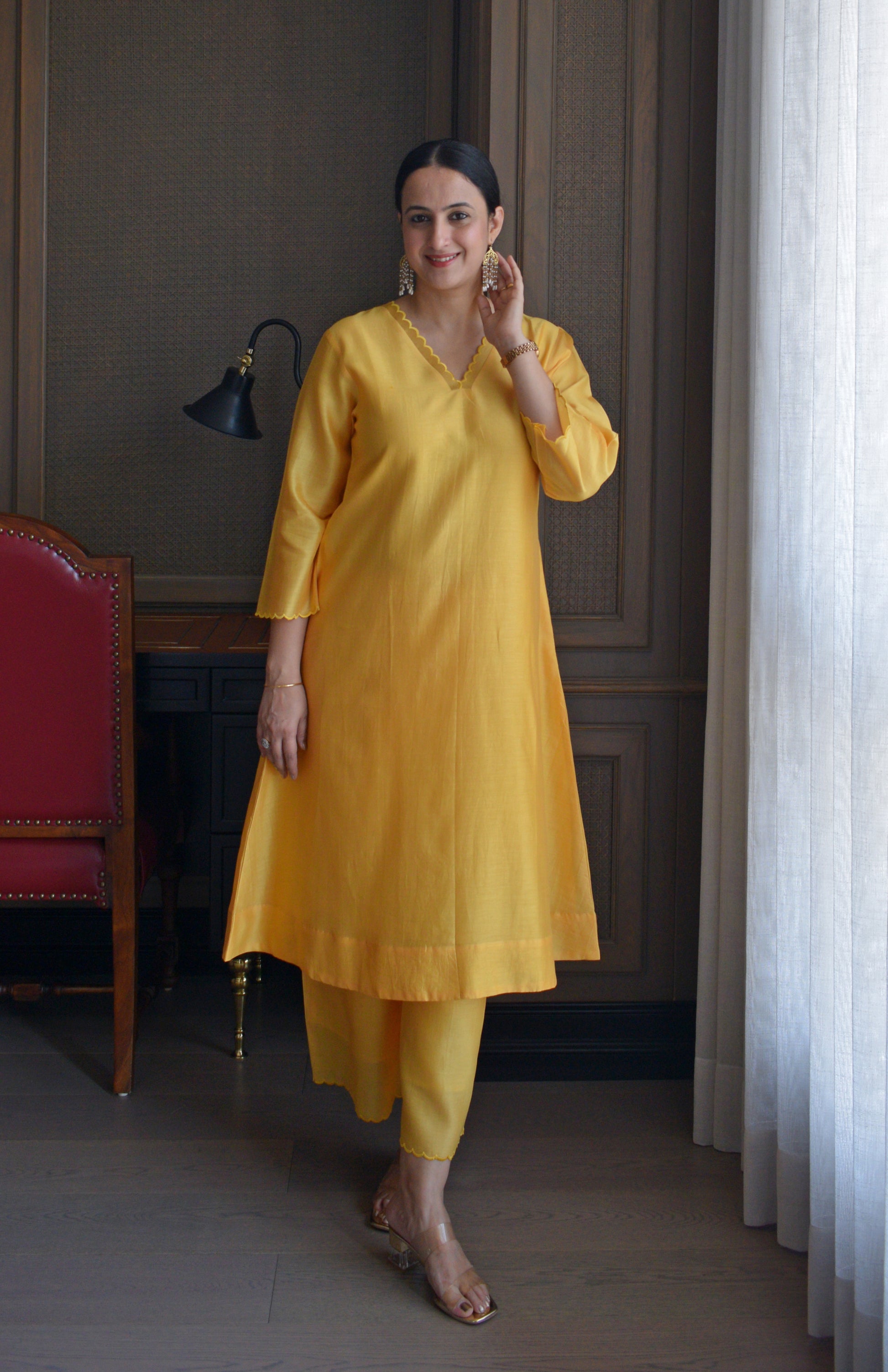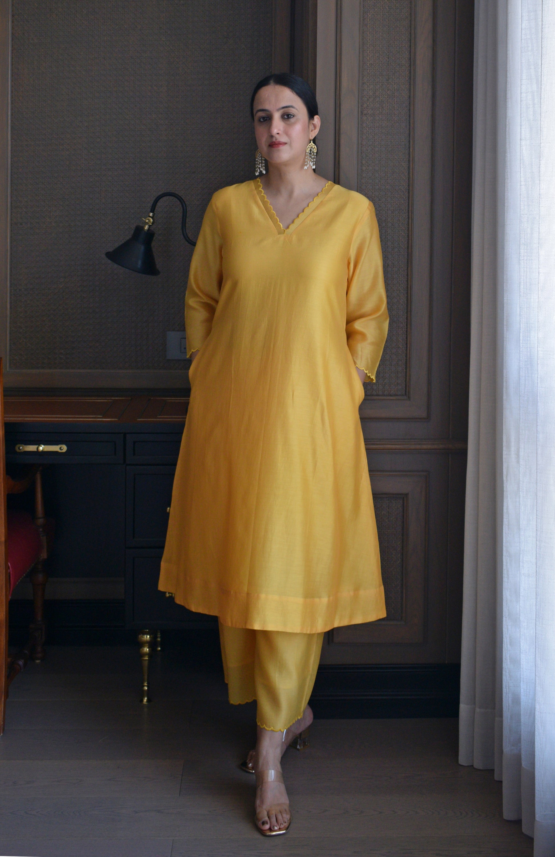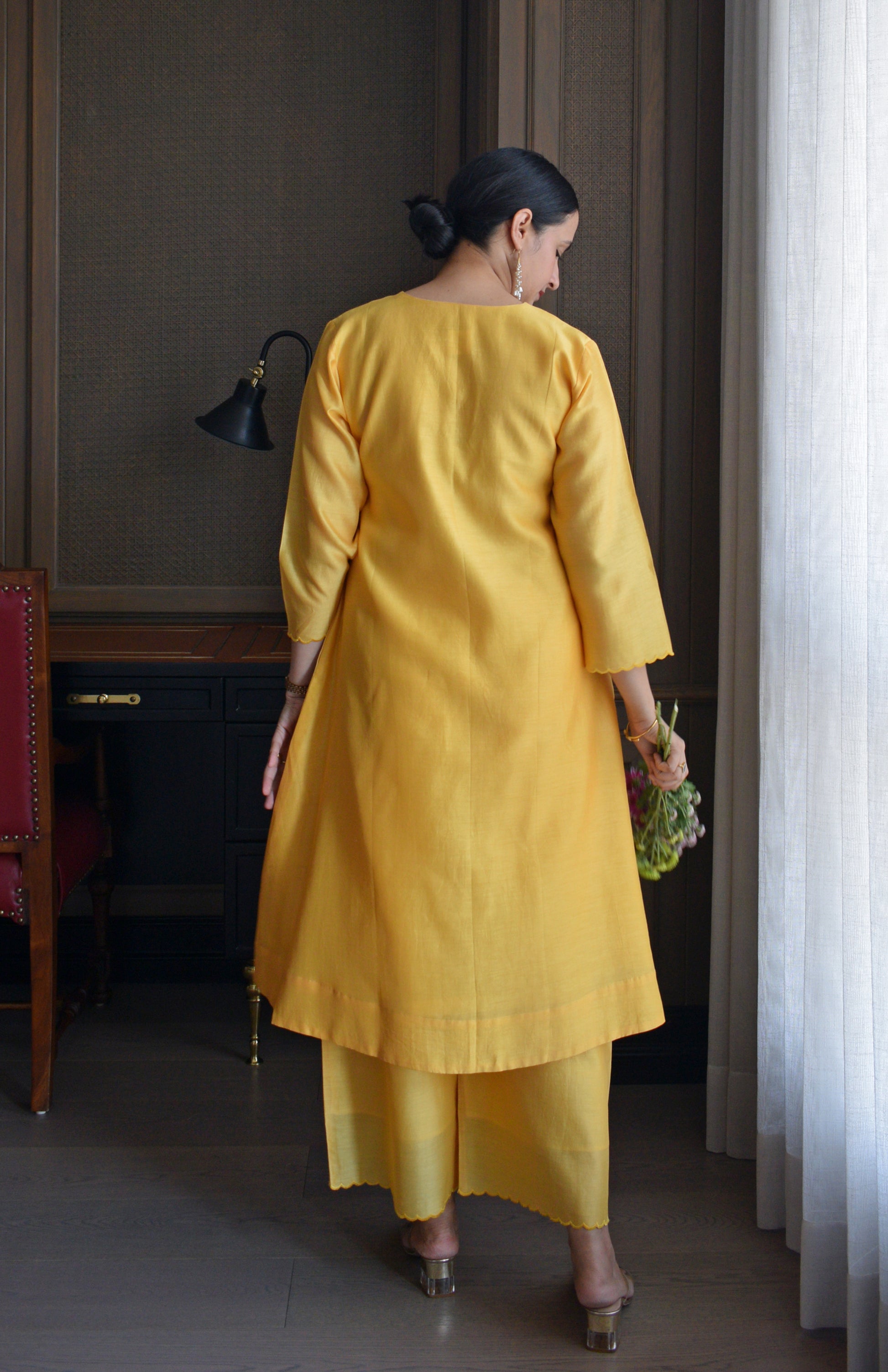 This graceful A-line Kurta Set is crafted from luxurious Chanderi Silk fabric and adorned with intricate embroidery. It features delicate scalloped edge detailing on the neckline, sleeves, and pajama hemline, adding a touch of sophistication. Both the kurta and pajama are fully lined with soft mul cotton for added comfort.