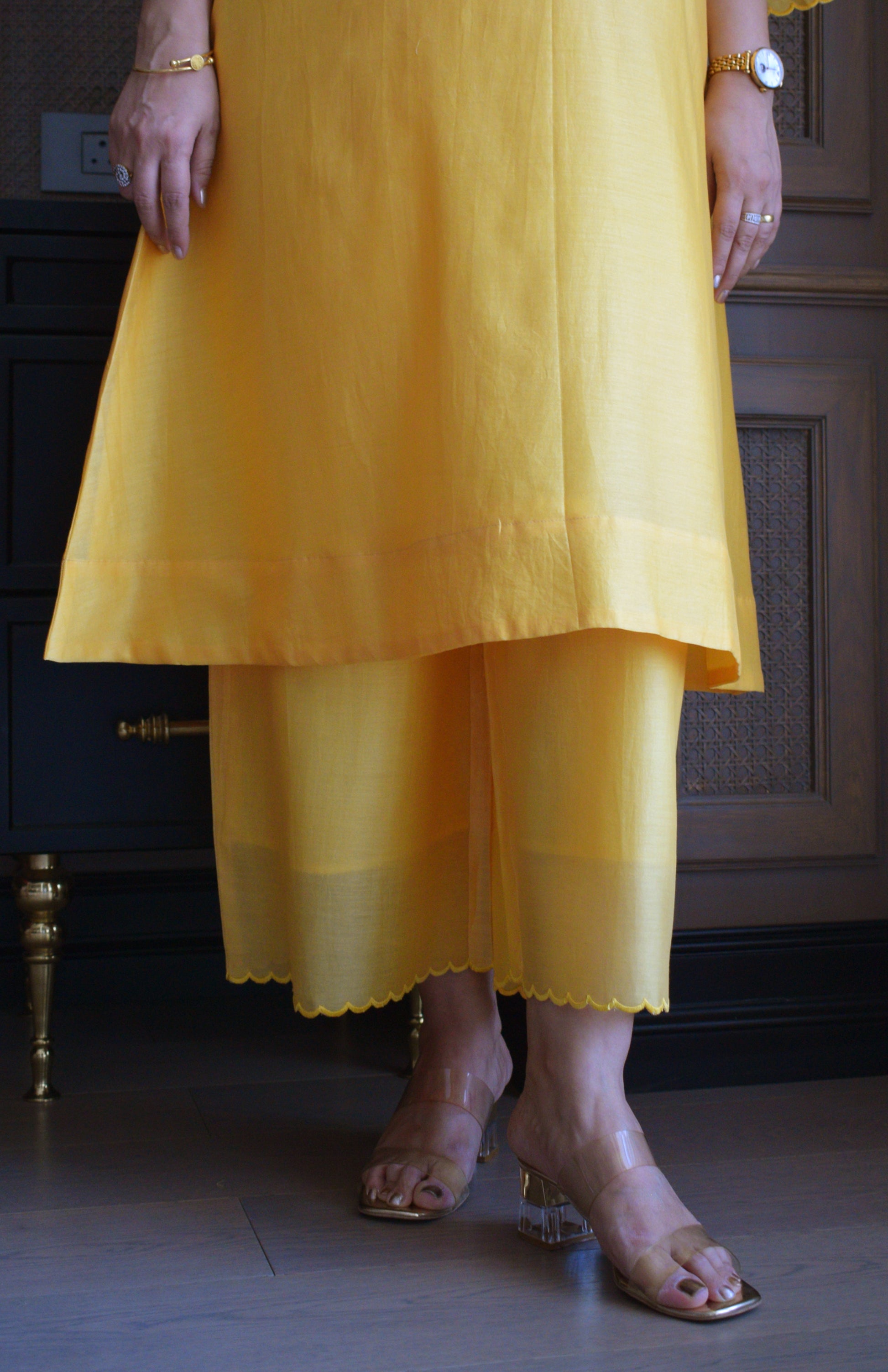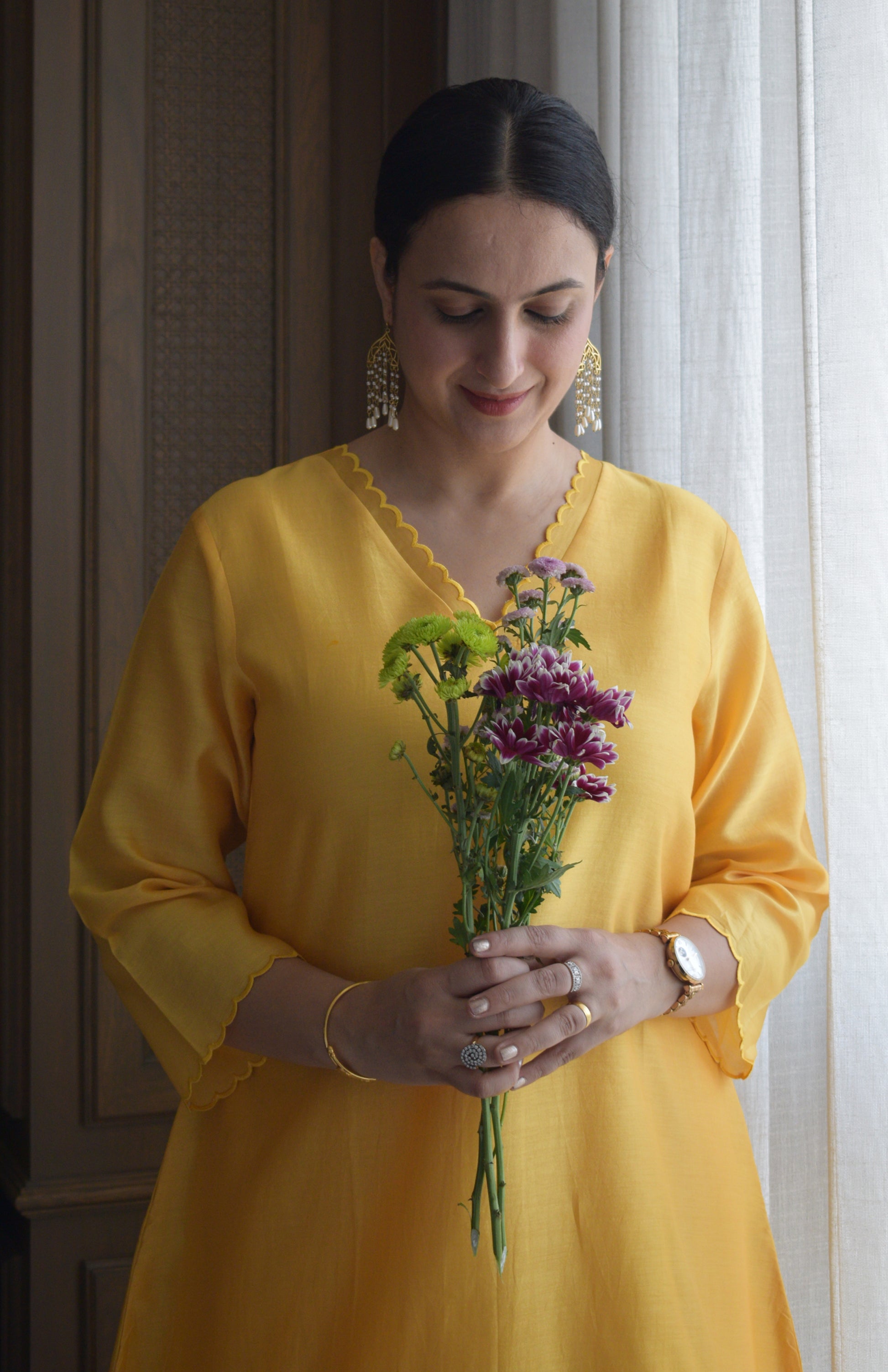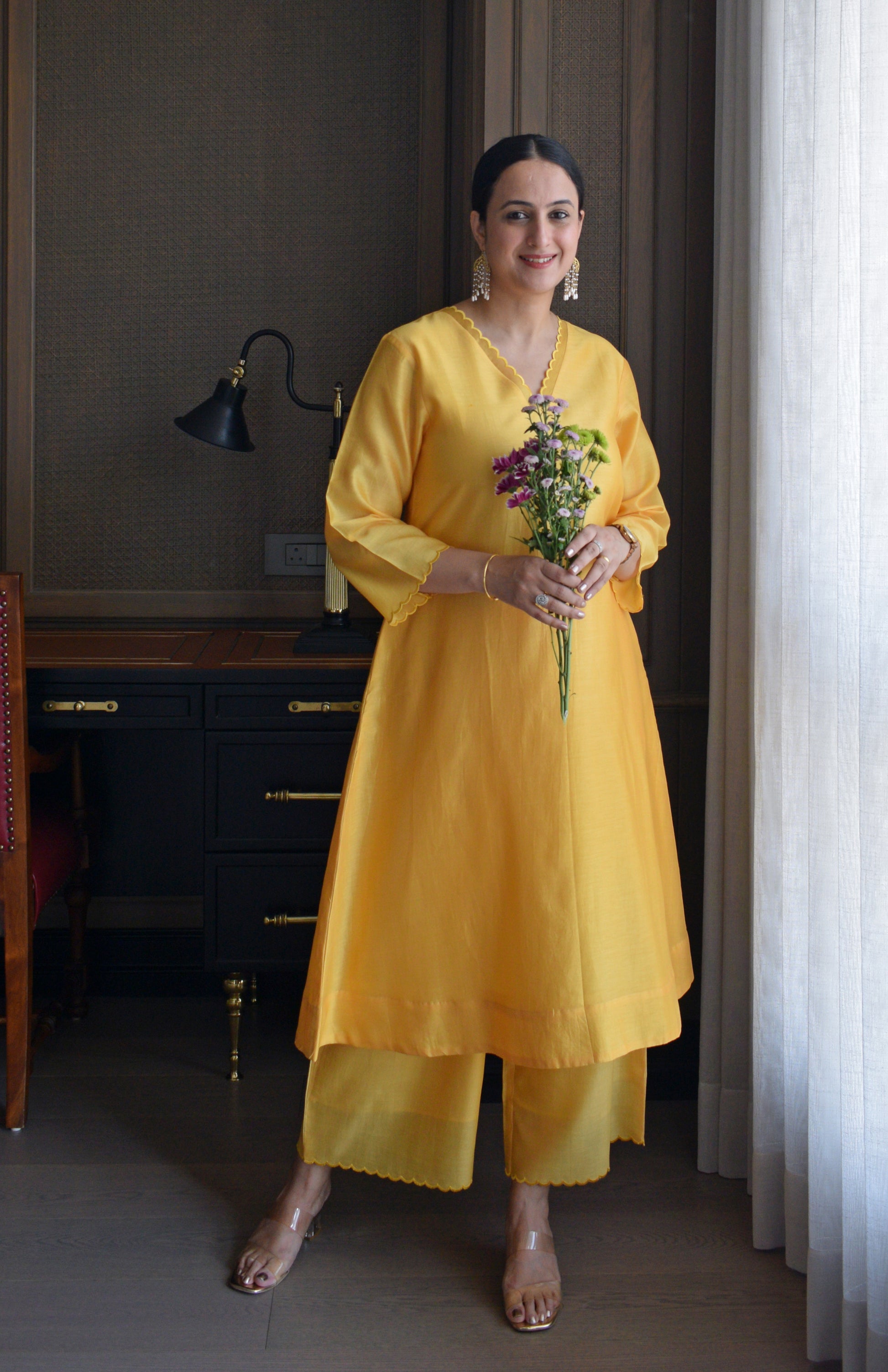 This graceful A-line Kurta Set is crafted from luxurious Chanderi Silk fabric and adorned with intricate embroidery. It features delicate scalloped edge detailing on the neckline, sleeves, and pajama hemline, adding a touch of sophistication. Both the kurta and pajama are fully lined with soft mul cotton for added comfort.