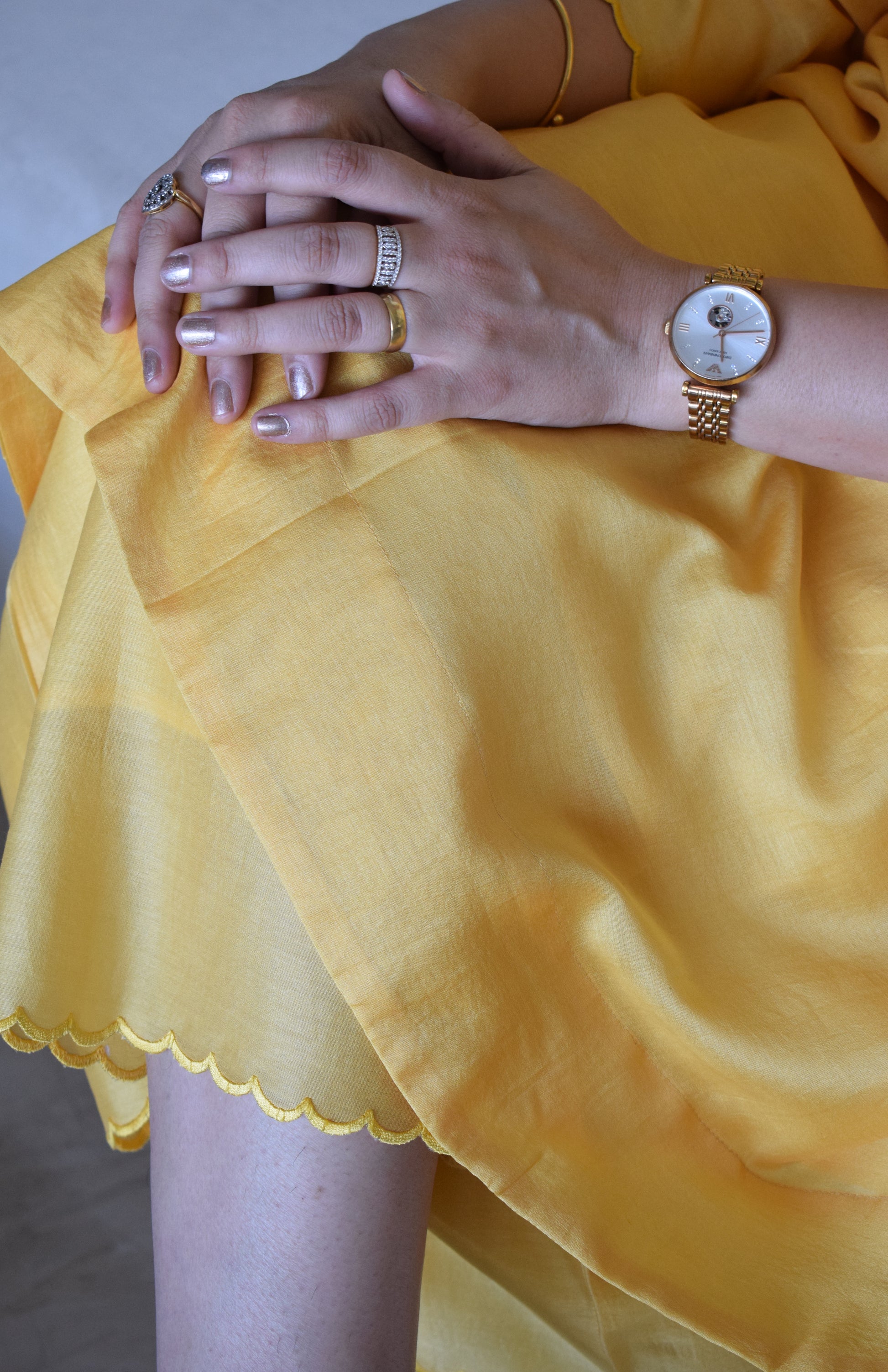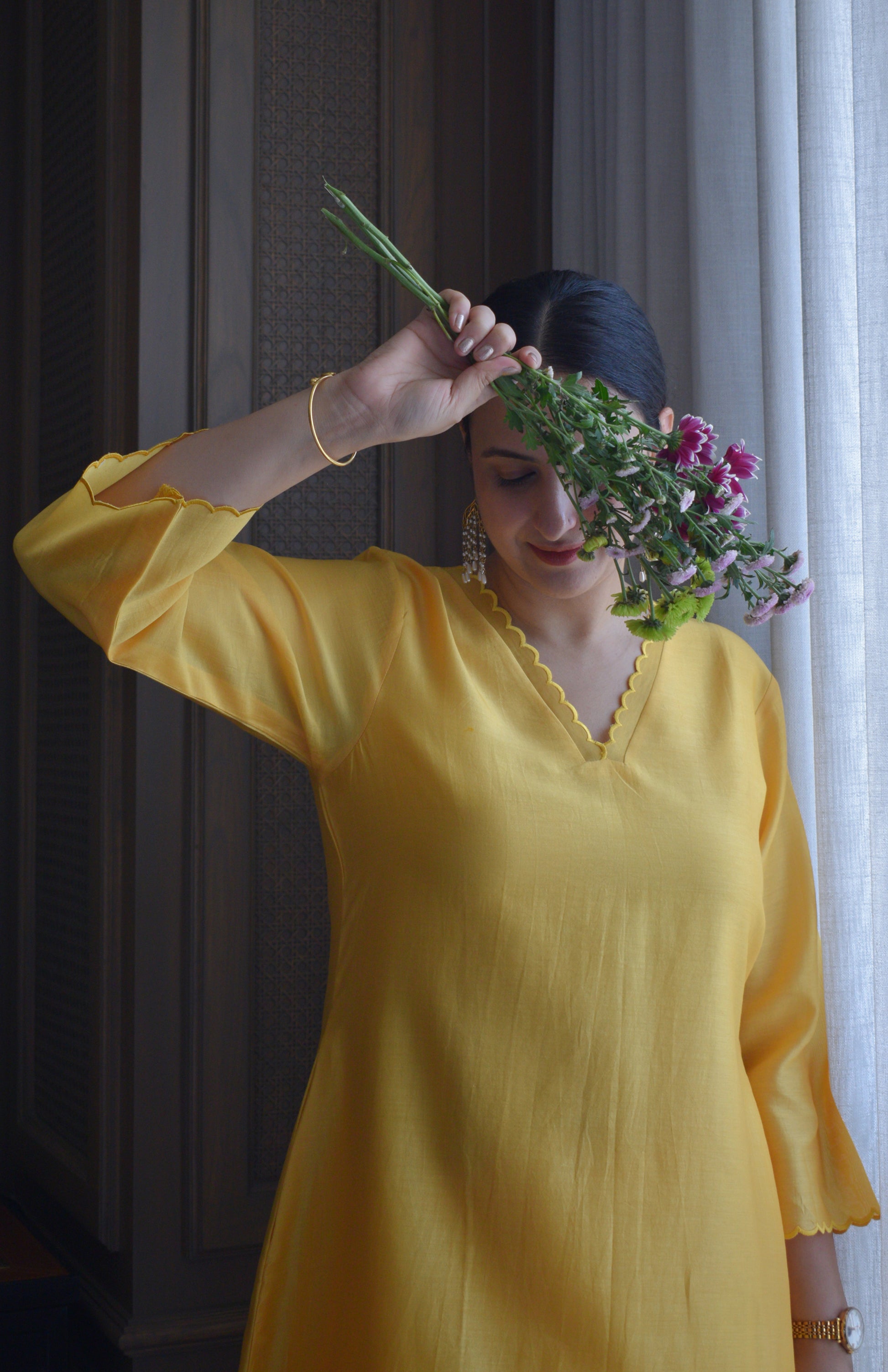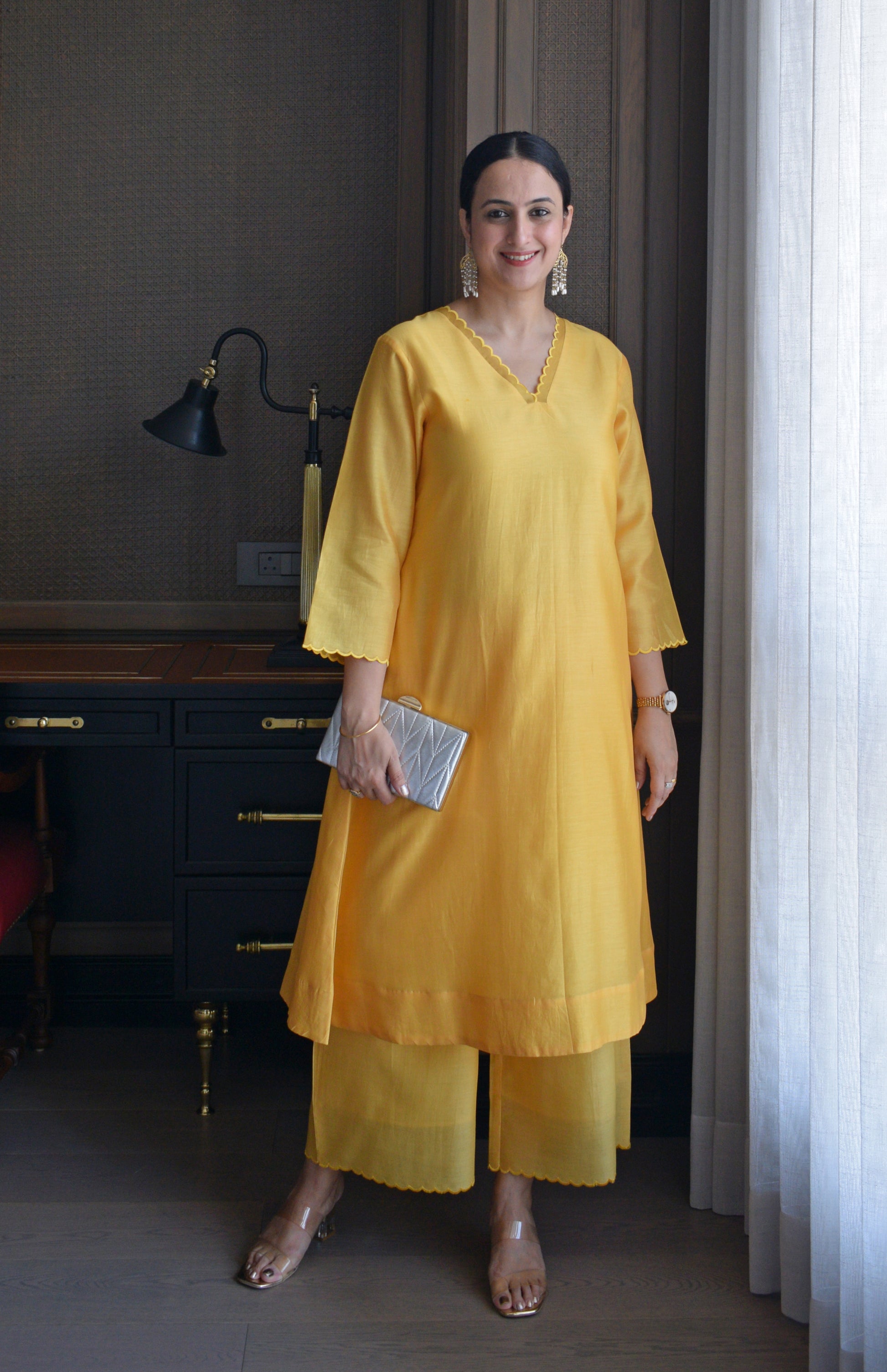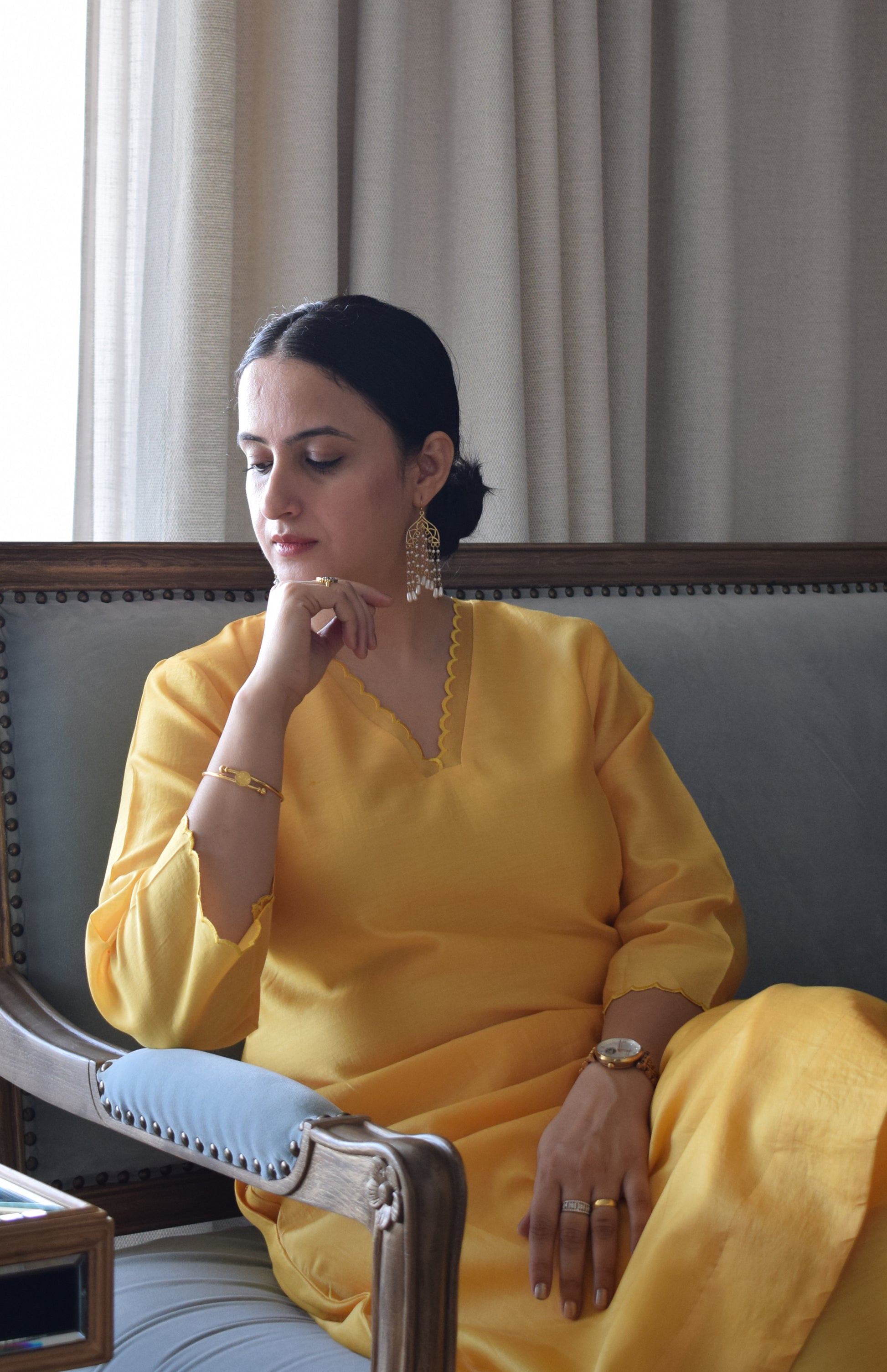 This graceful A-line Kurta Set is crafted from luxurious Chanderi Silk fabric and adorned with intricate embroidery. It features delicate scalloped edge detailing on the neckline, sleeves, and pajama hemline, adding a touch of sophistication. Both the kurta and pajama are fully lined with soft mul cotton for added comfort.