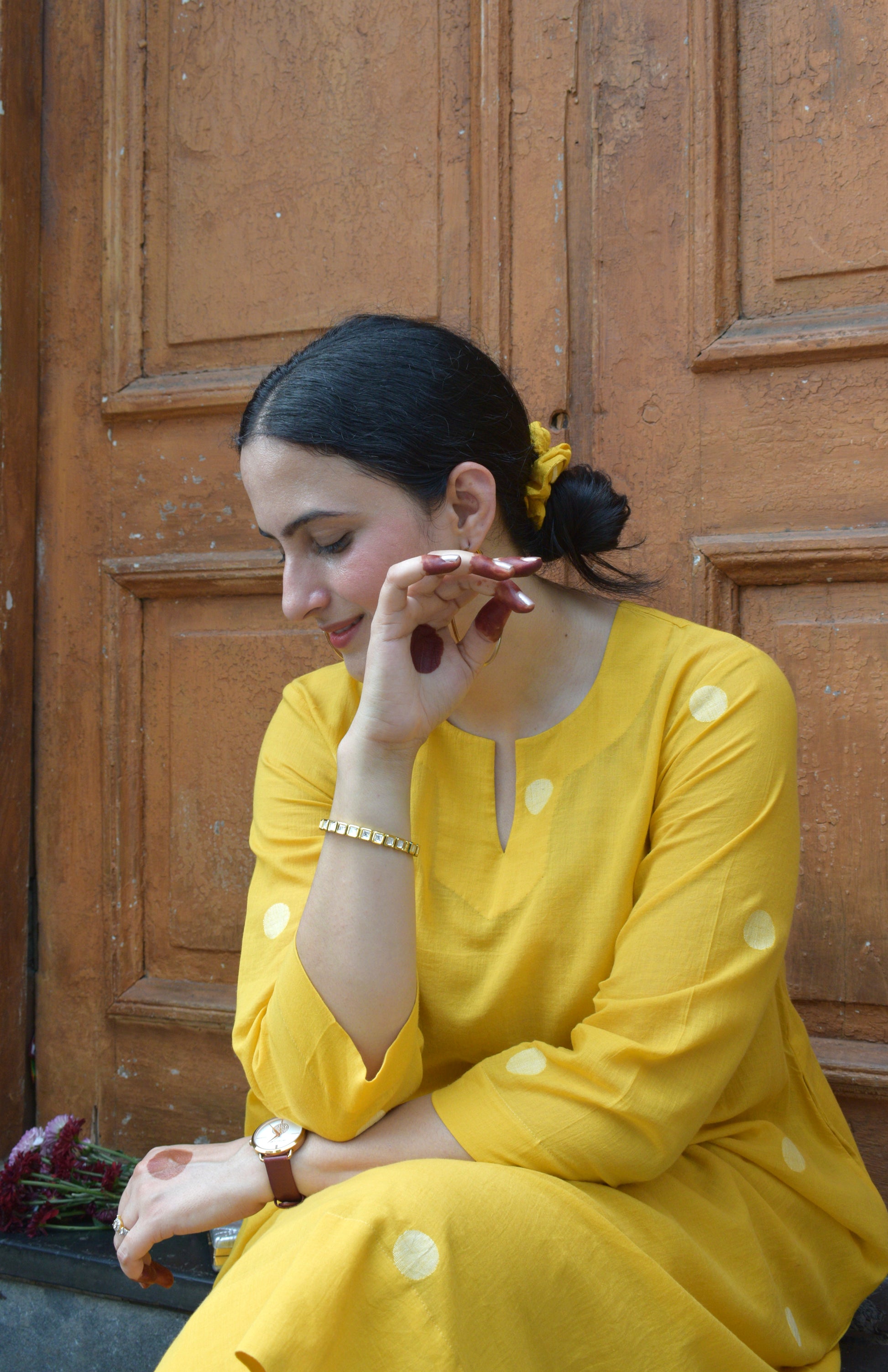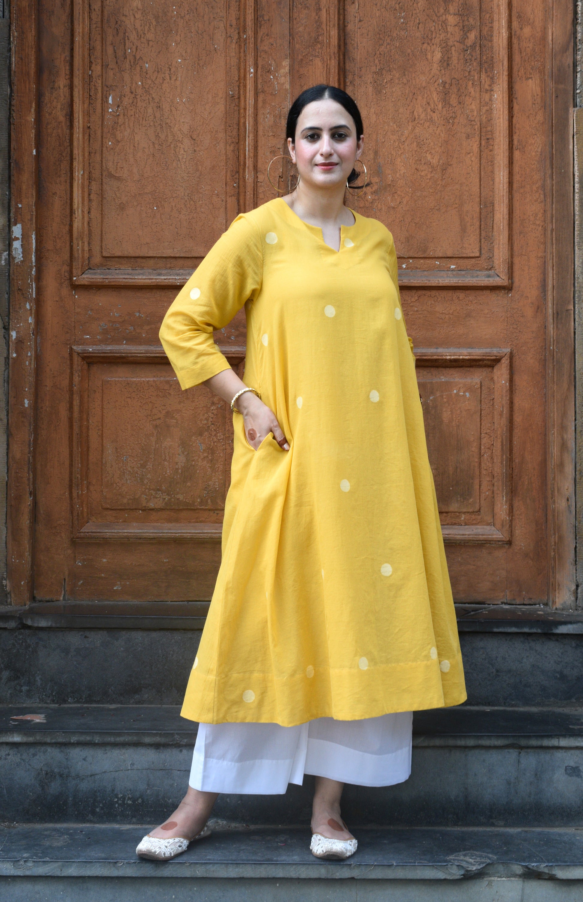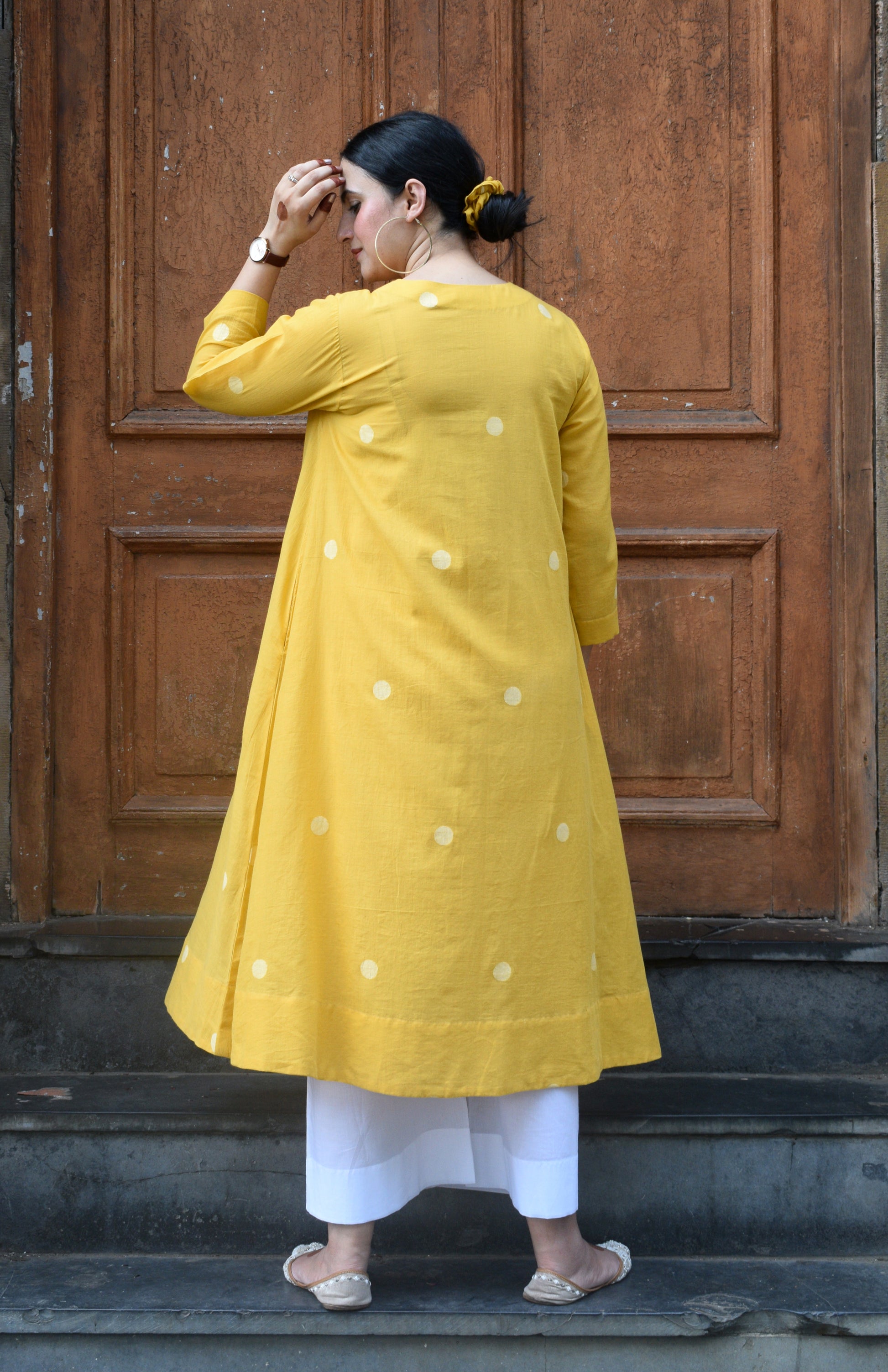 Our Yellow jamdani A line kurta can be easily styled with our sunkissed white basic pajama or paired with light blue denims for a casual look. Perfect for summers this hand woven jamdani kurta is a must have in your wardrobe