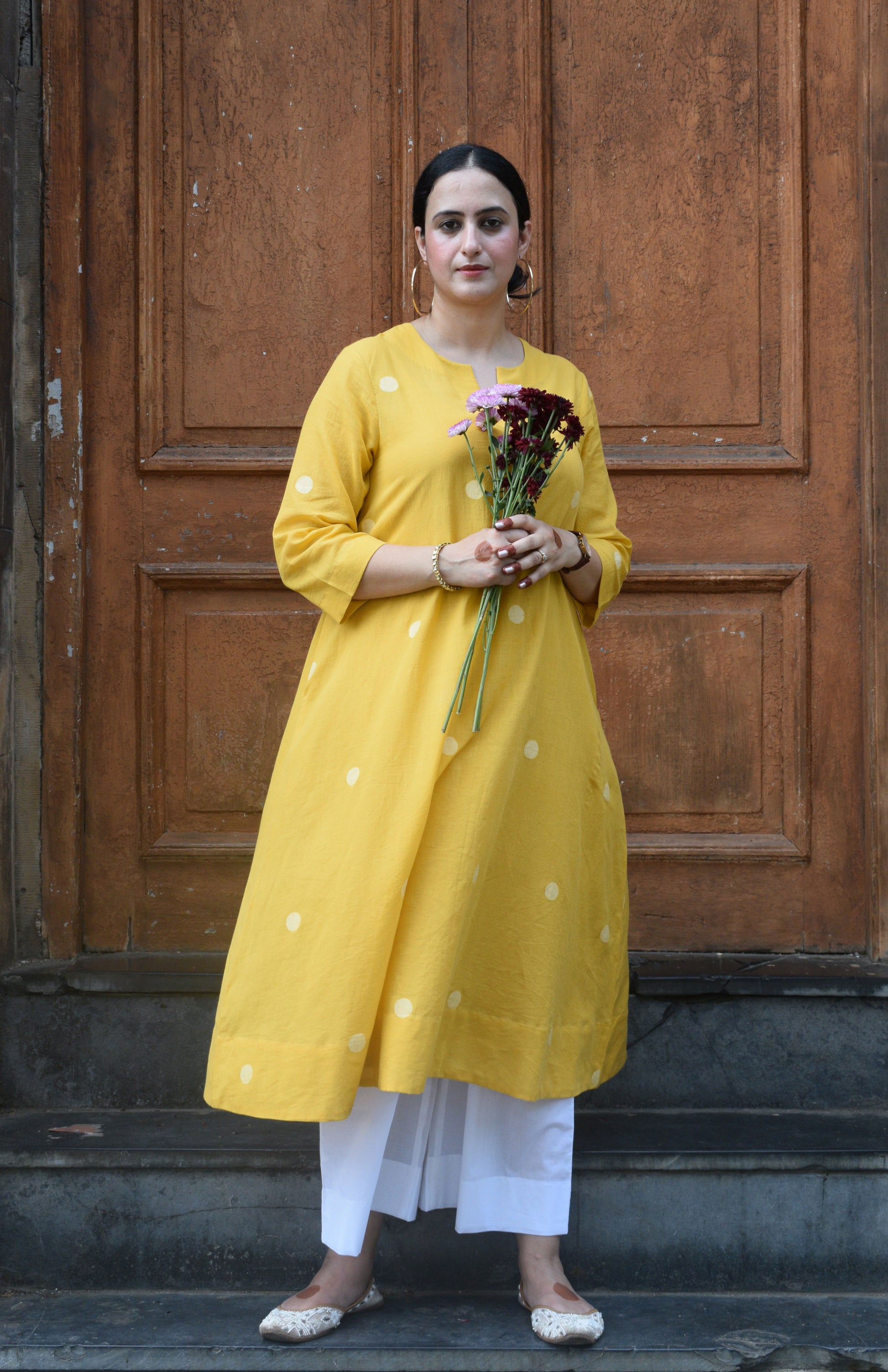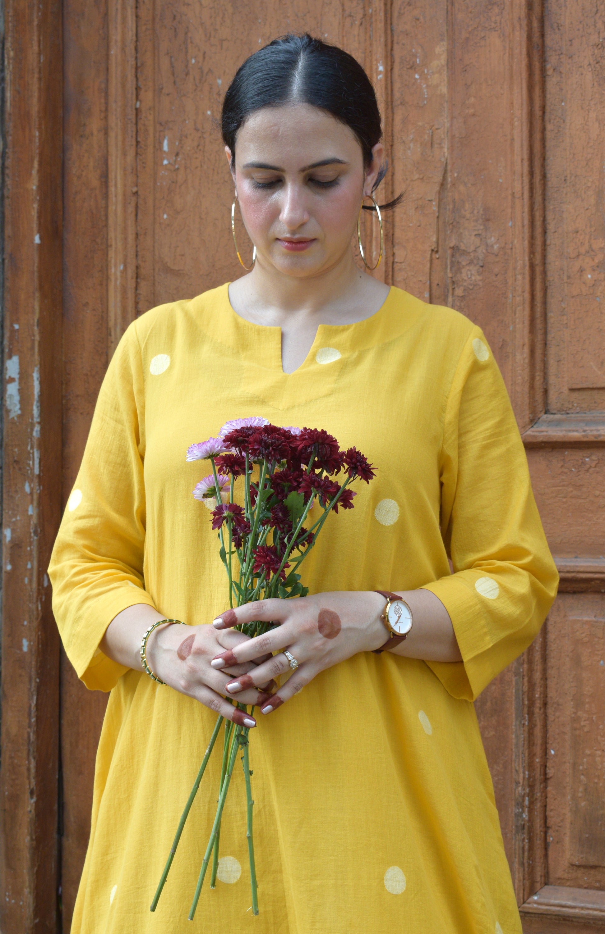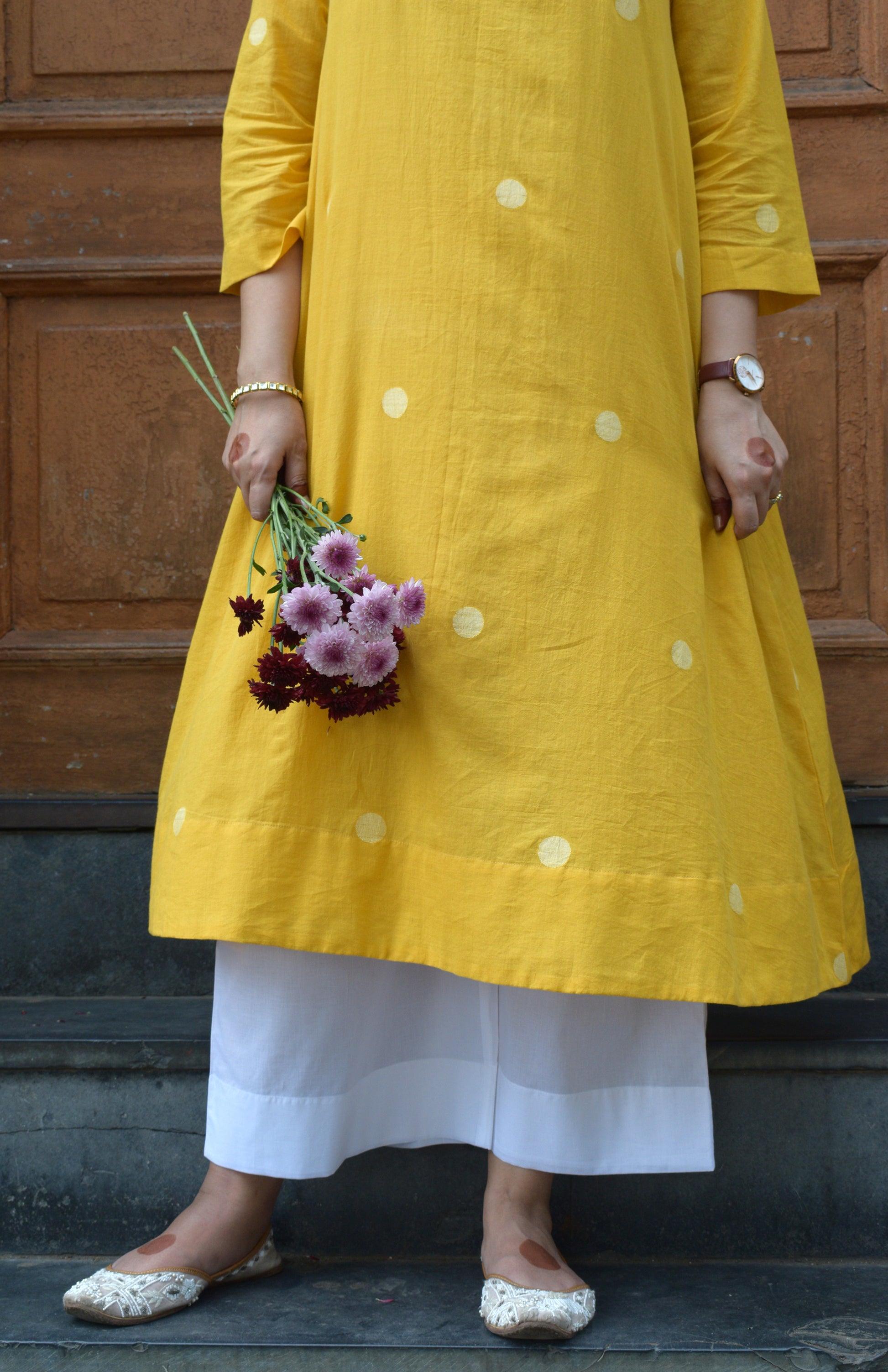 Our Yellow jamdani A line kurta can be easily styled with our sunkissed white basic pajama or paired with light blue denims for a casual look. Perfect for summers this hand woven jamdani kurta is a must have in your wardrobe