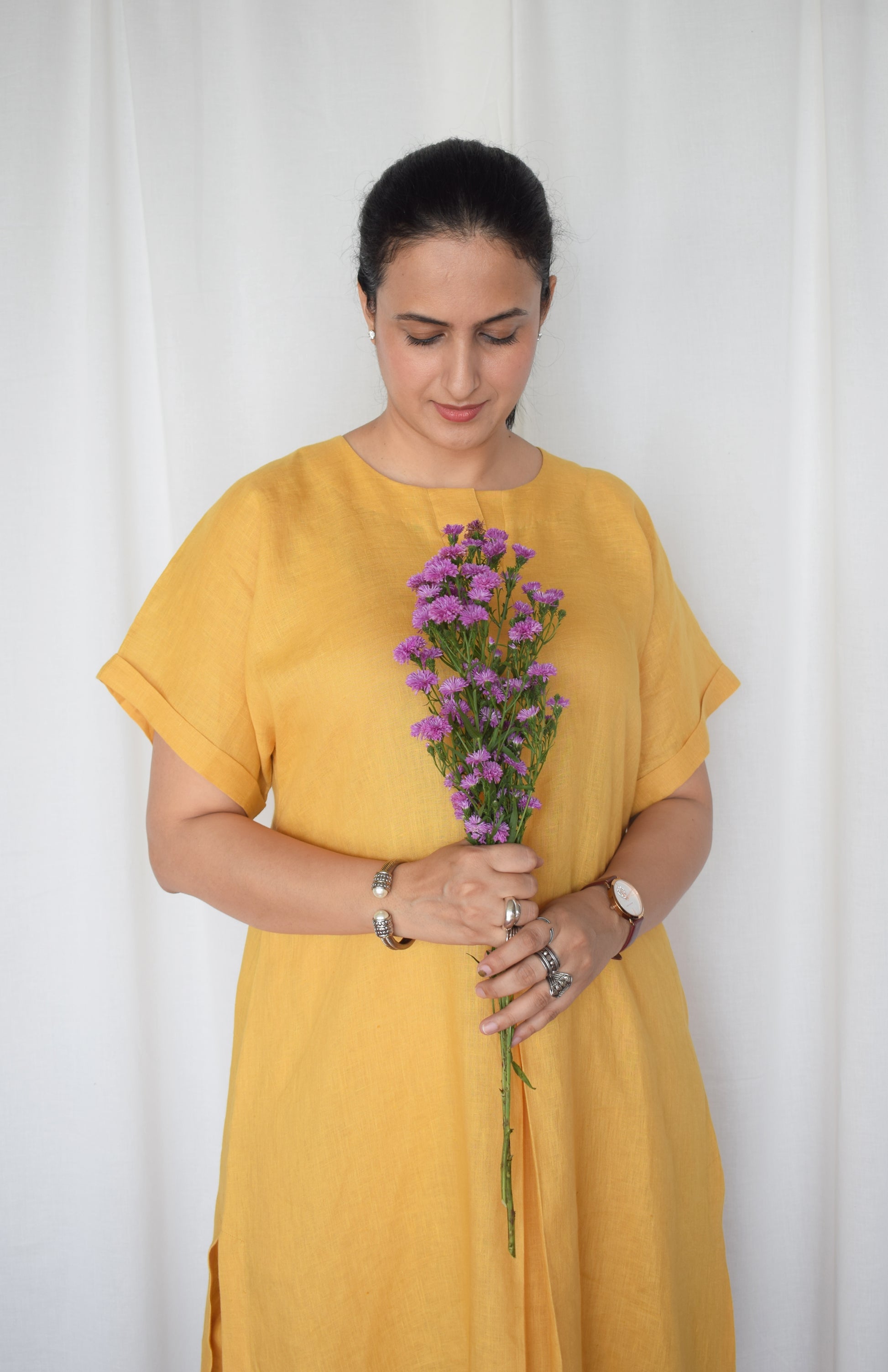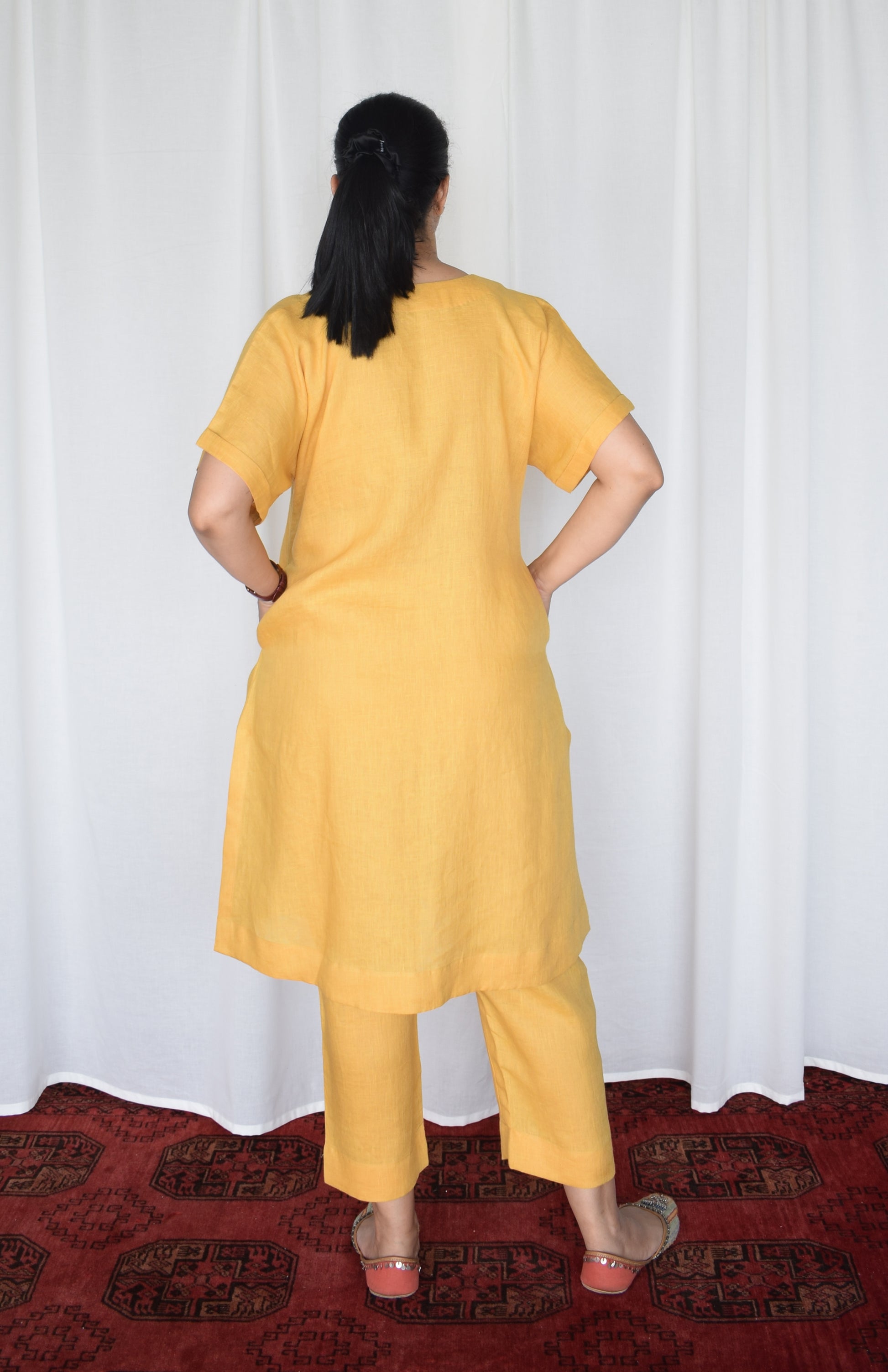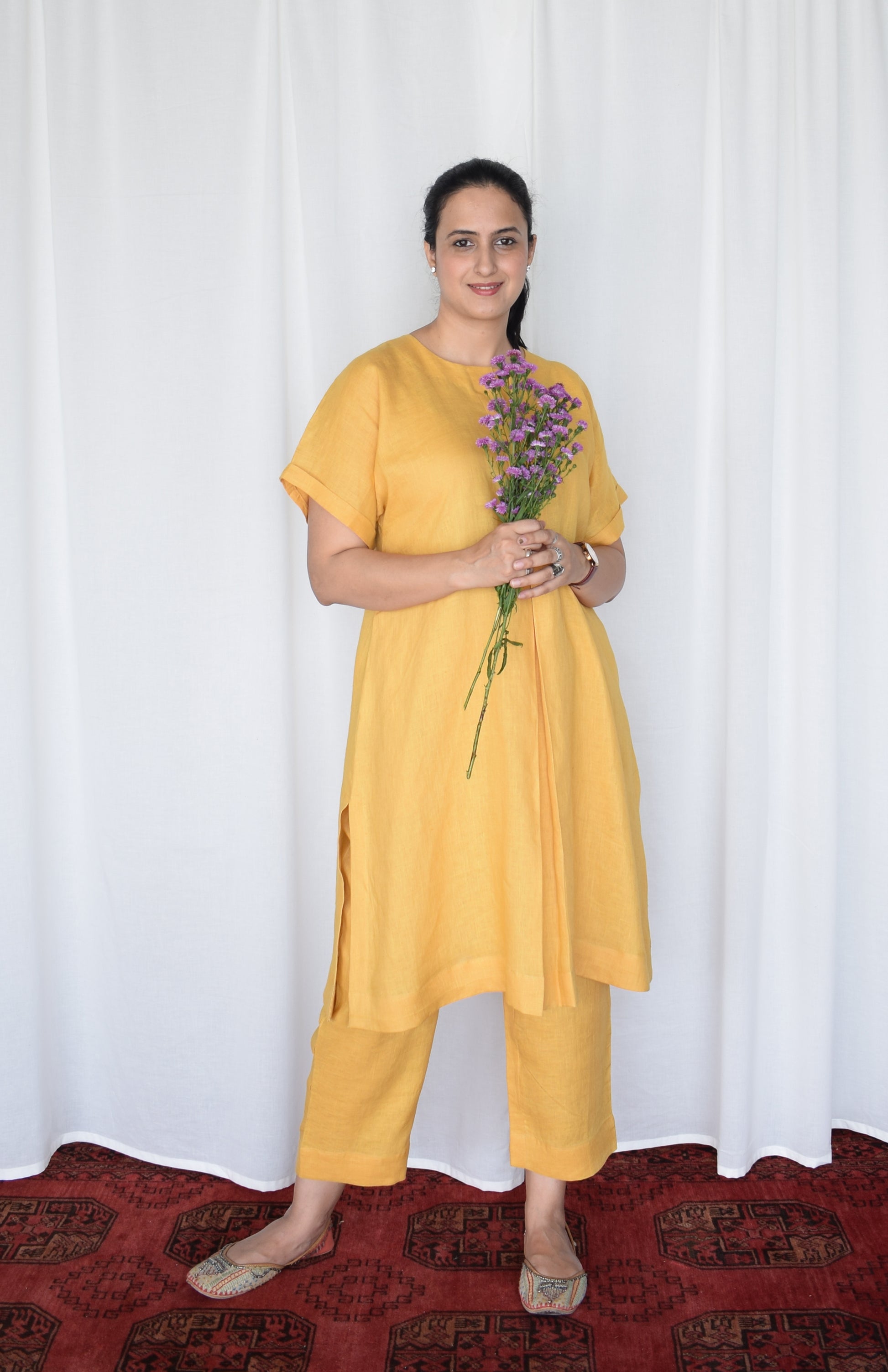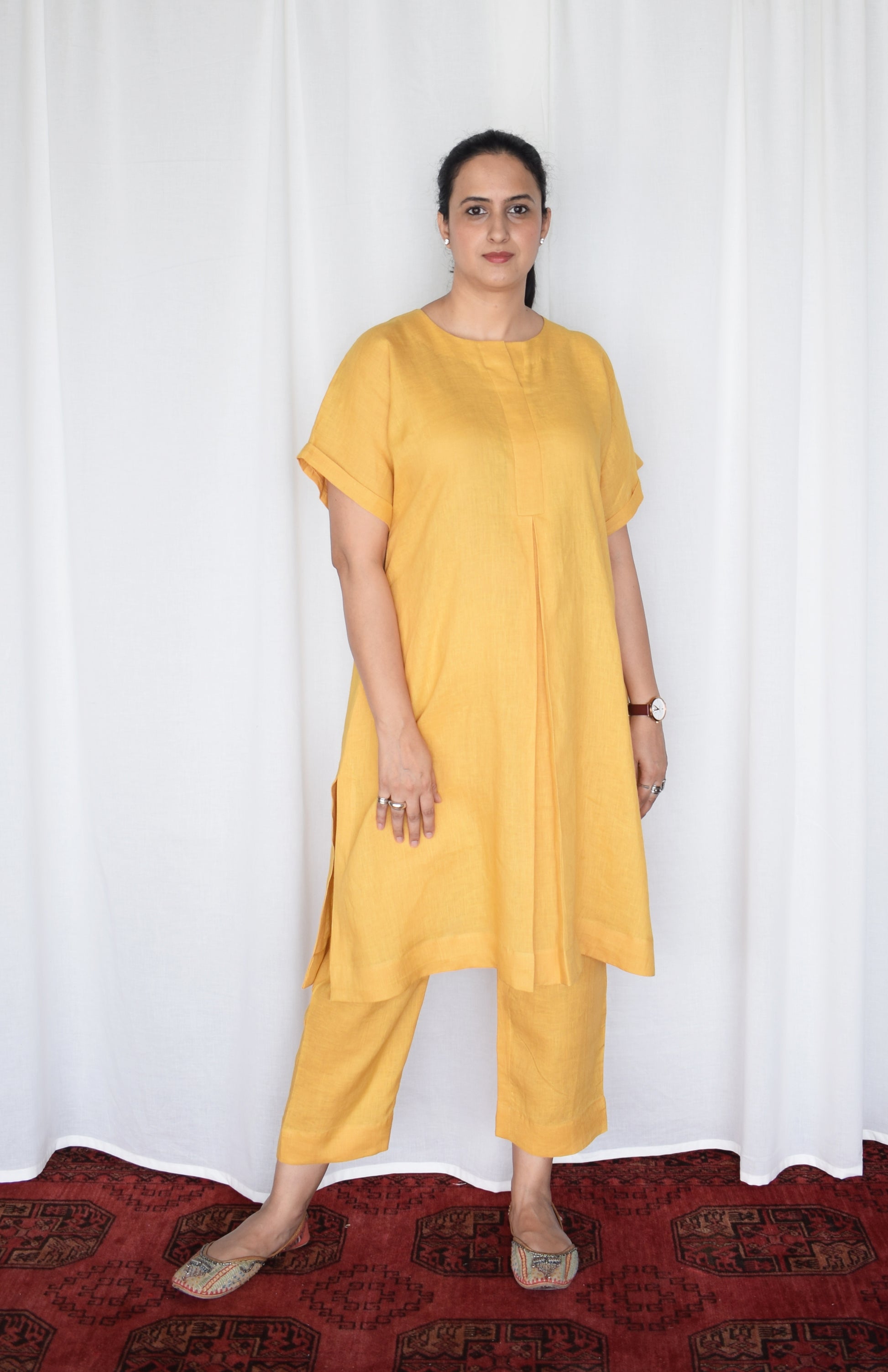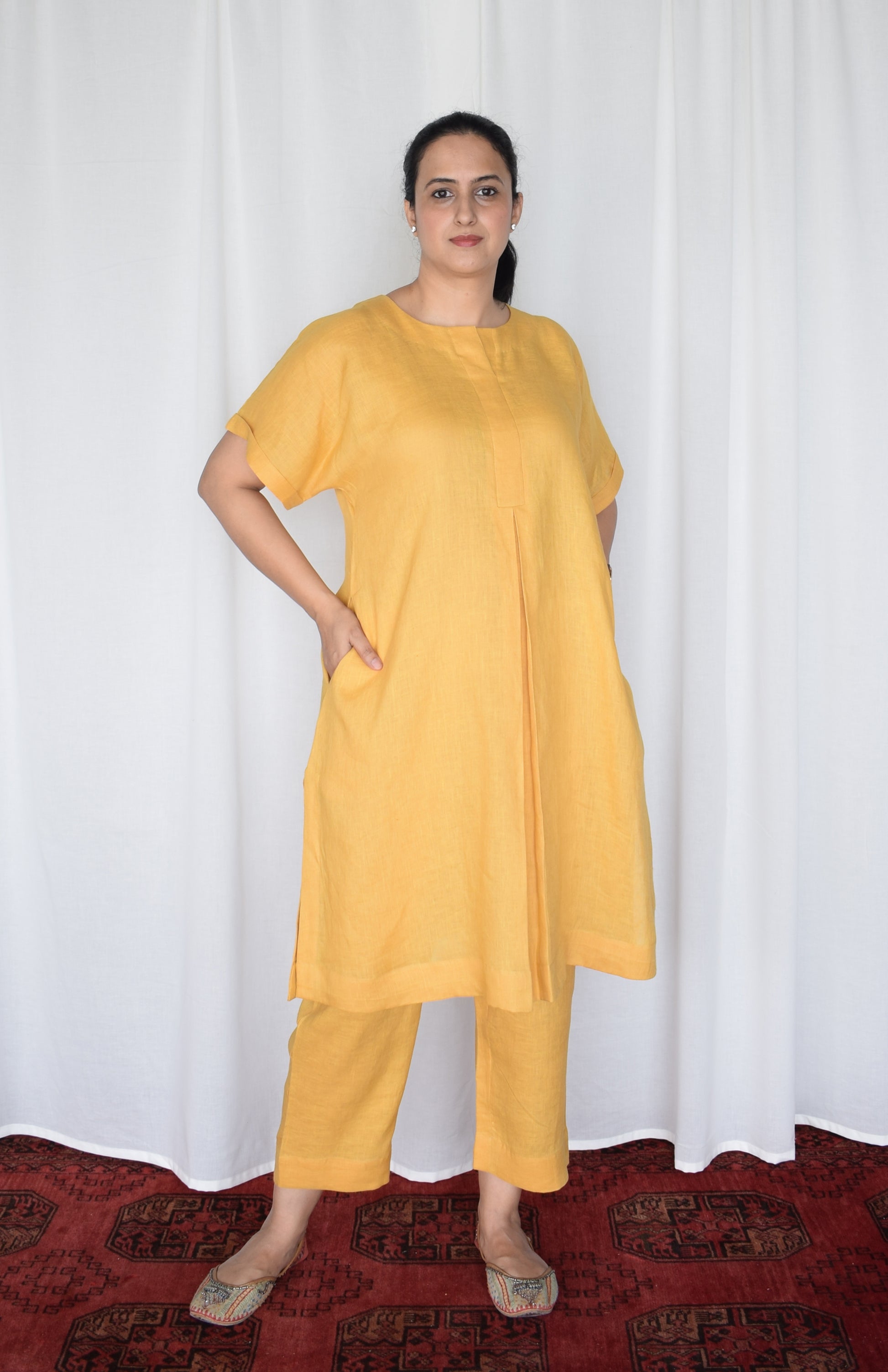 Loose-fitted pure linen kurta with short kimono sleeves and side pockets. This kurta features a round shaped neckline, front box pleat detail with straight cut hemline This kurta comes with yellow straight leg pajamas in the same fabric with full elastic waistband.