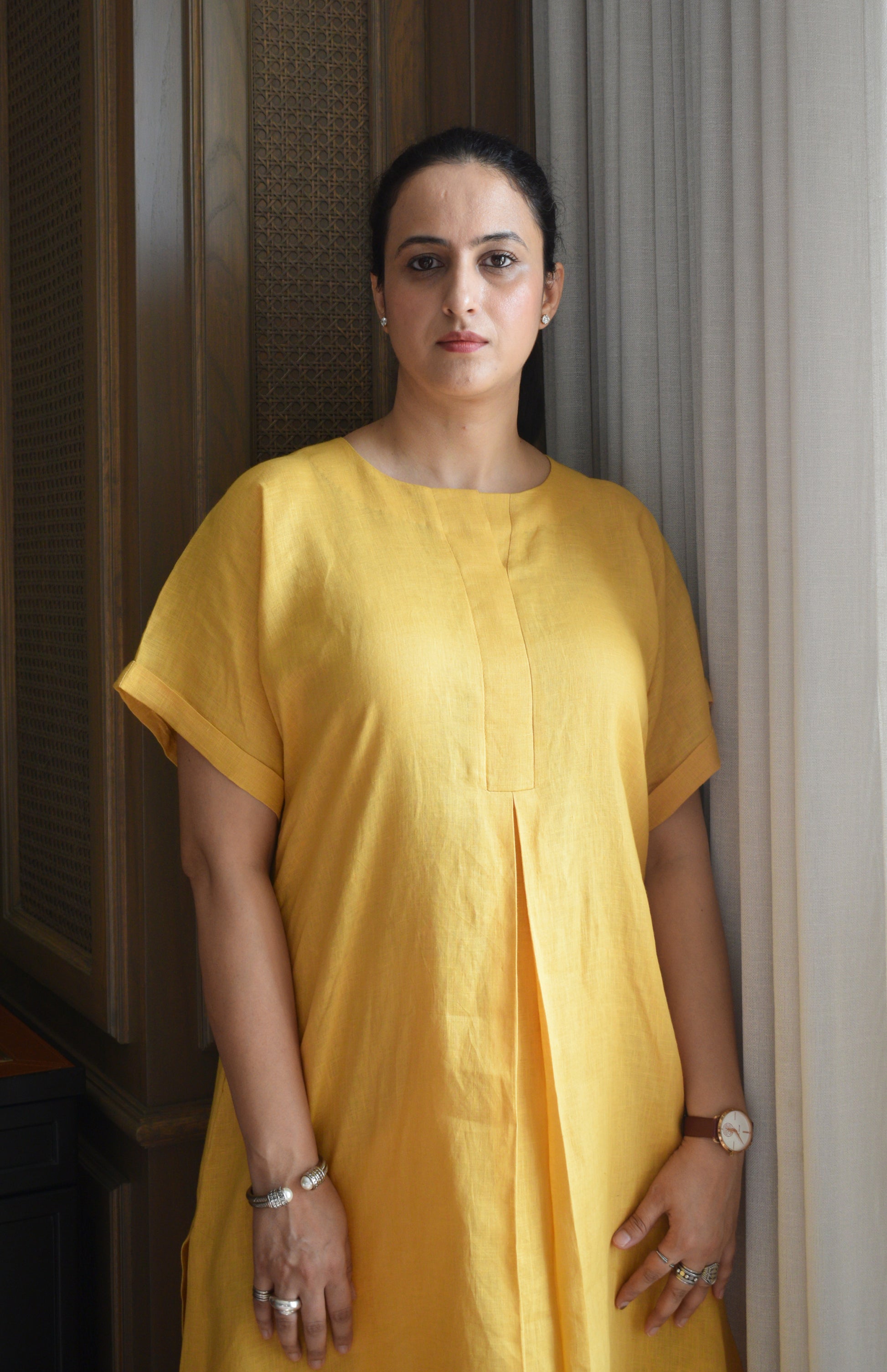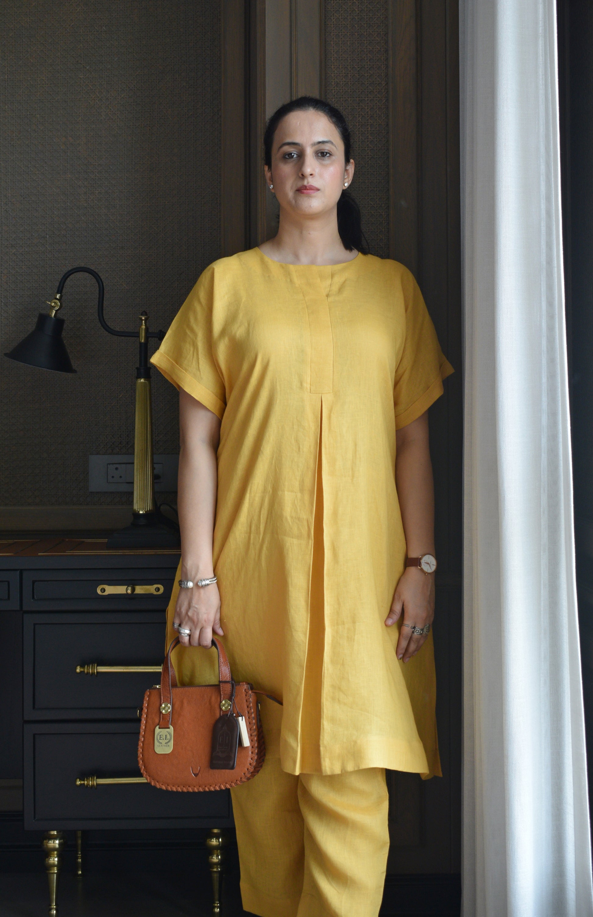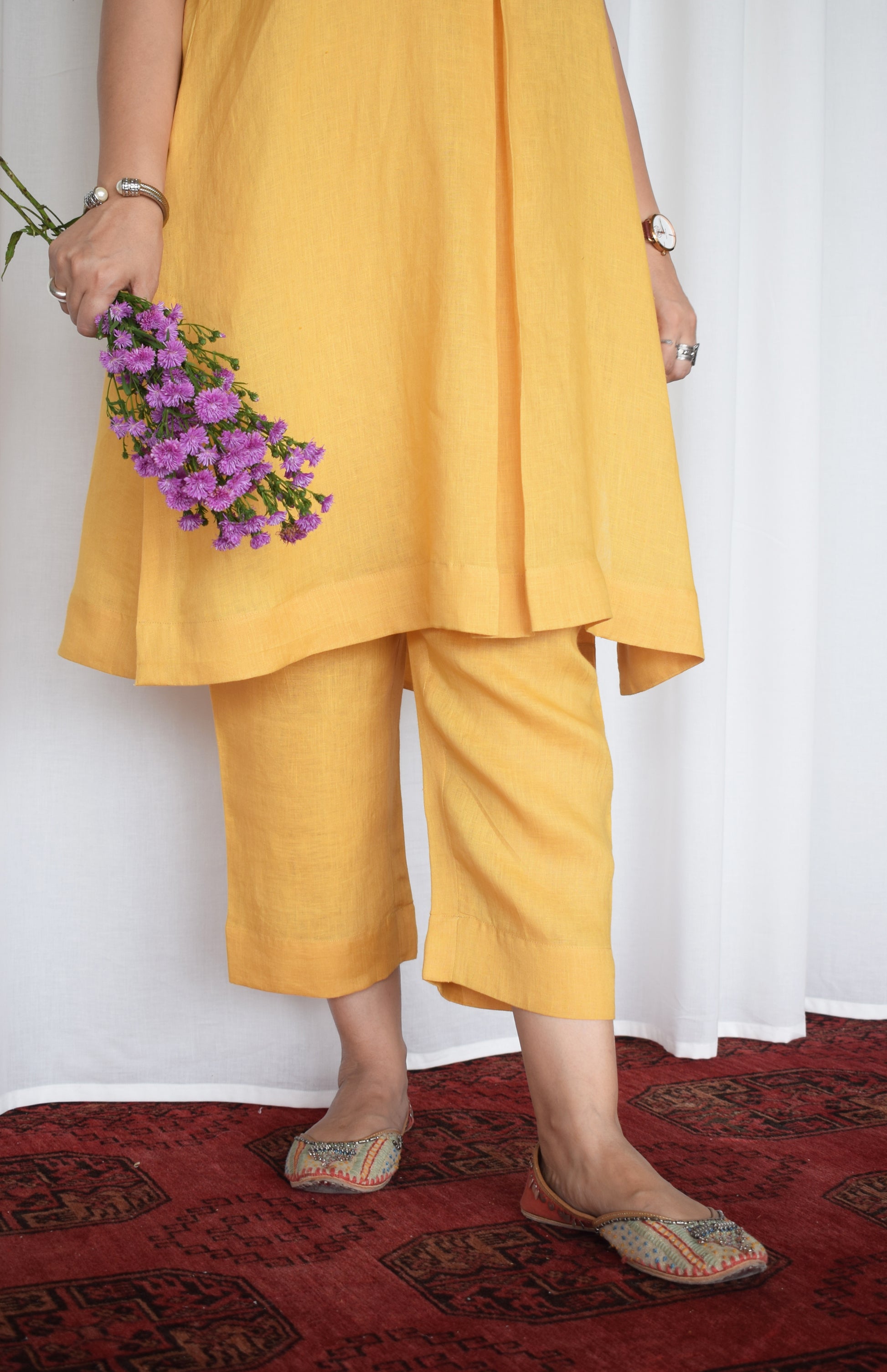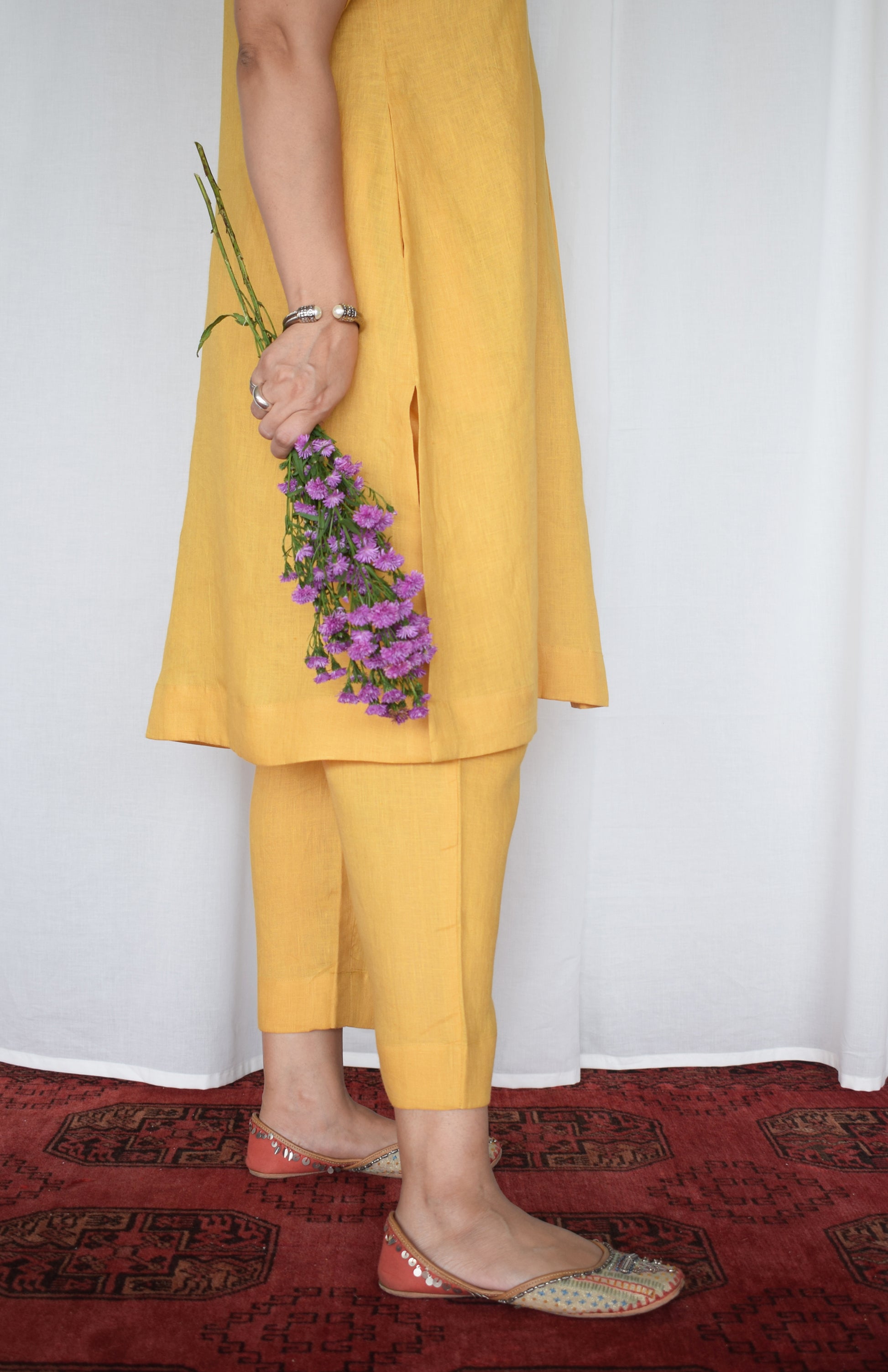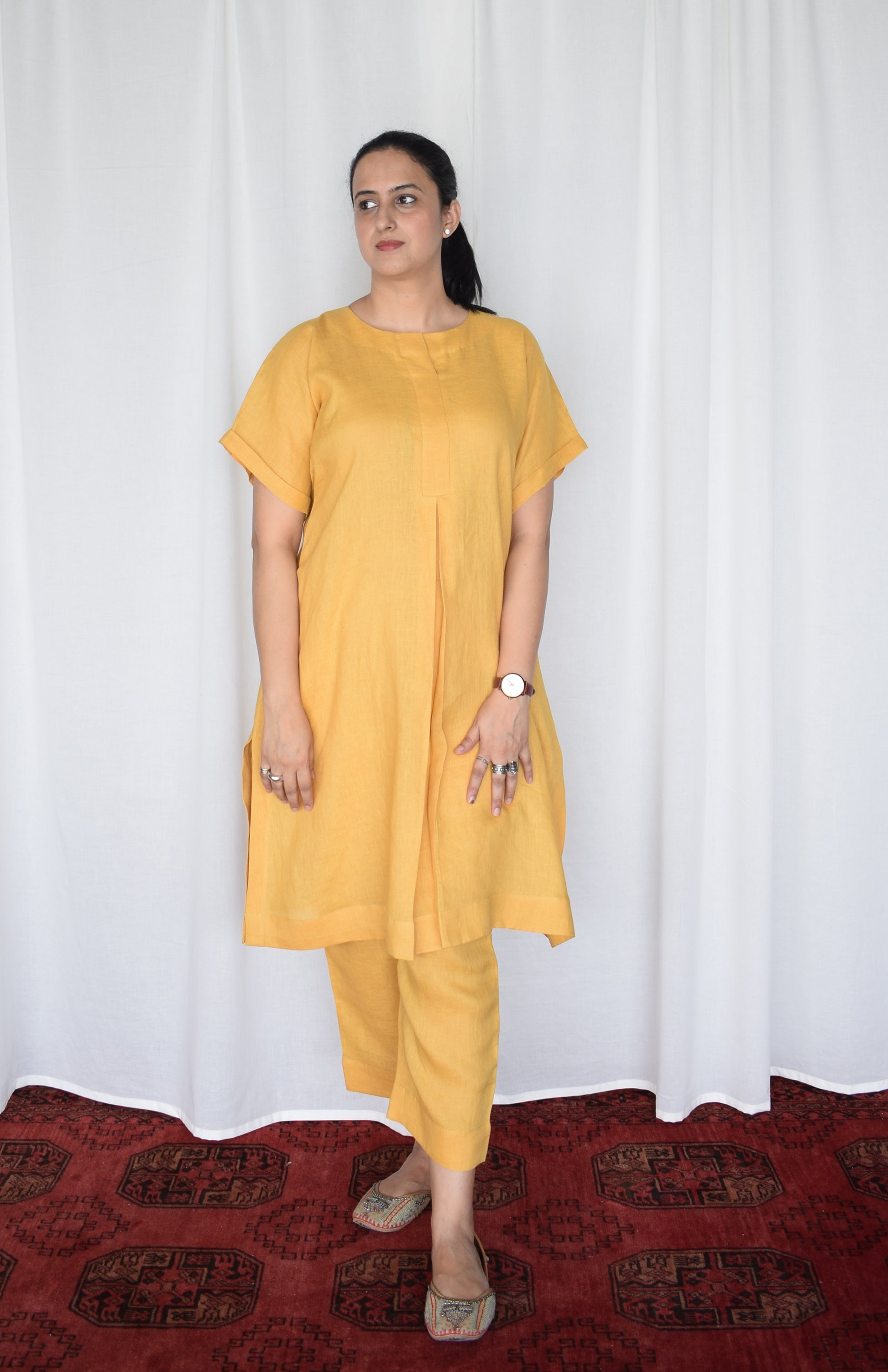 Loose-fitted pure linen kurta with short kimono sleeves and side pockets. This kurta features a round shaped neckline, front box pleat detail with straight cut hemline This kurta comes with yellow straight leg pajamas in the same fabric with full elastic waistband.