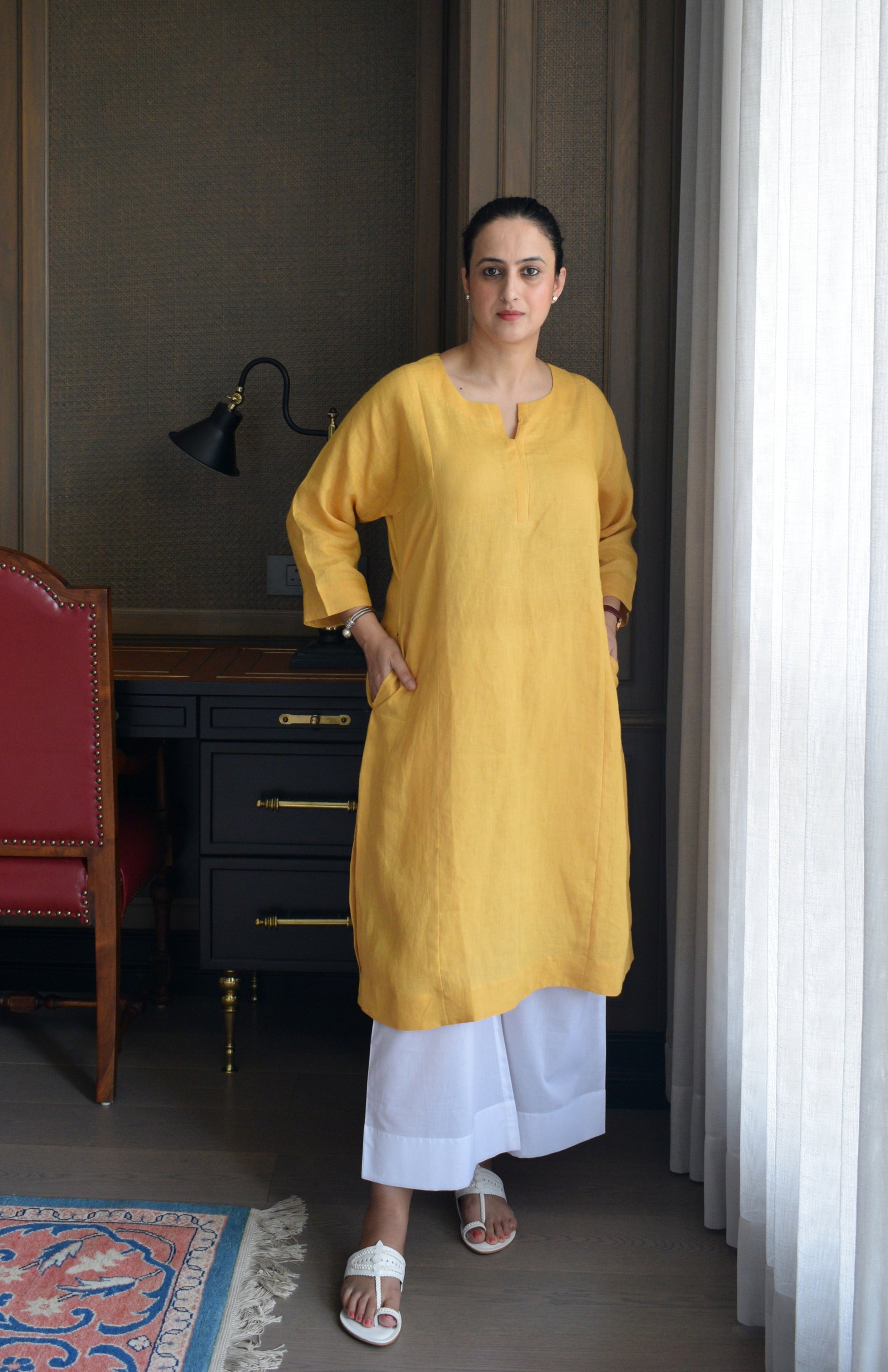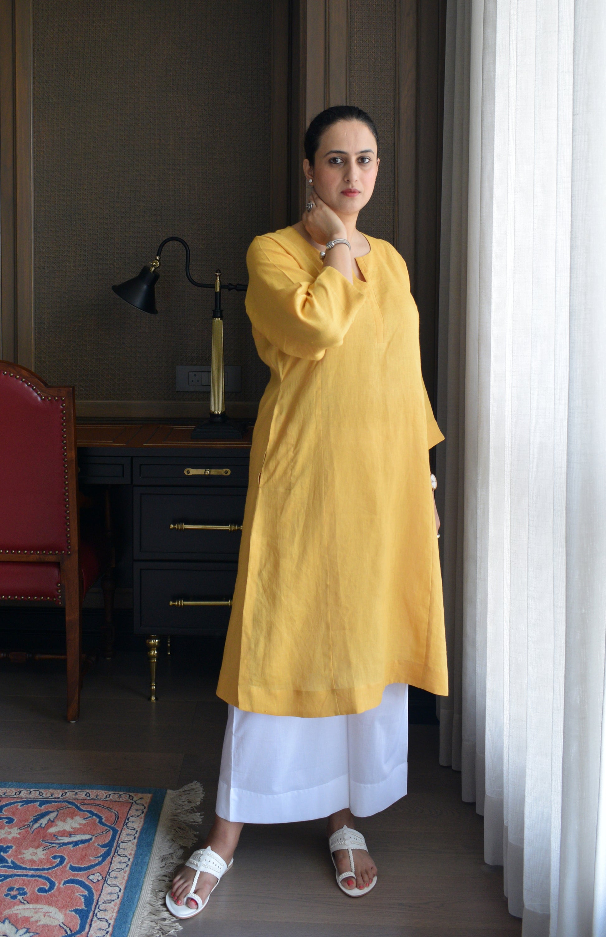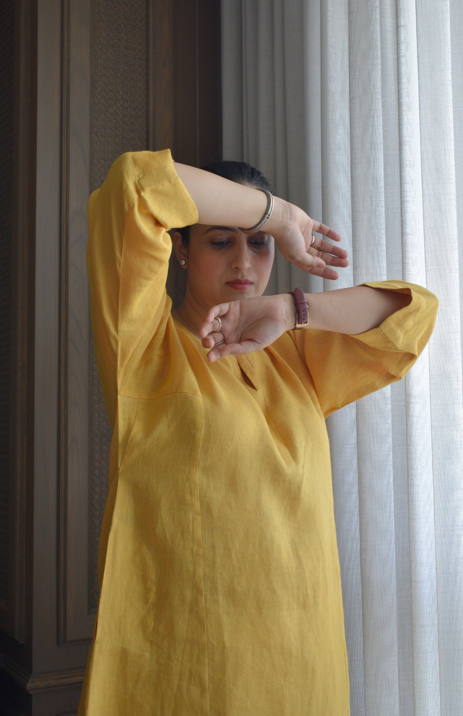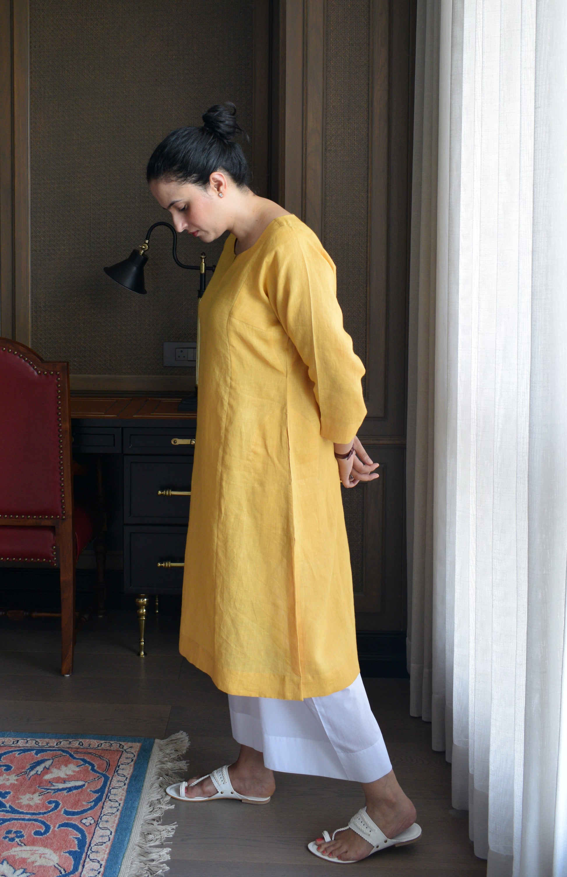 Our yellow linen straight fit paneled kurta can easily be styled with our sunkissed white basic pyjama or our multicolored striped linen pyjama for a semi formal look. You can keep the look minimalistic with a sleek watch and simple earrings.