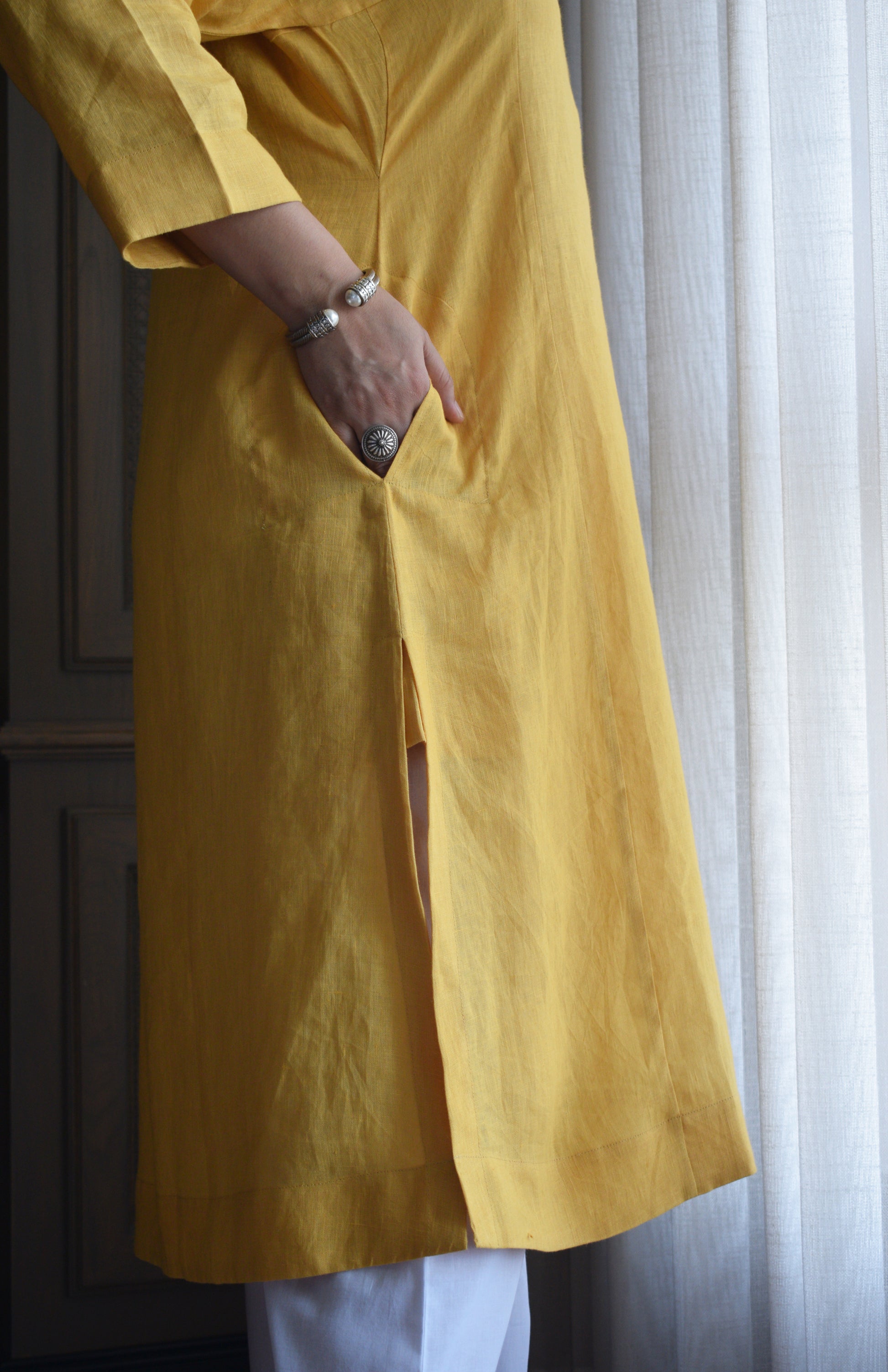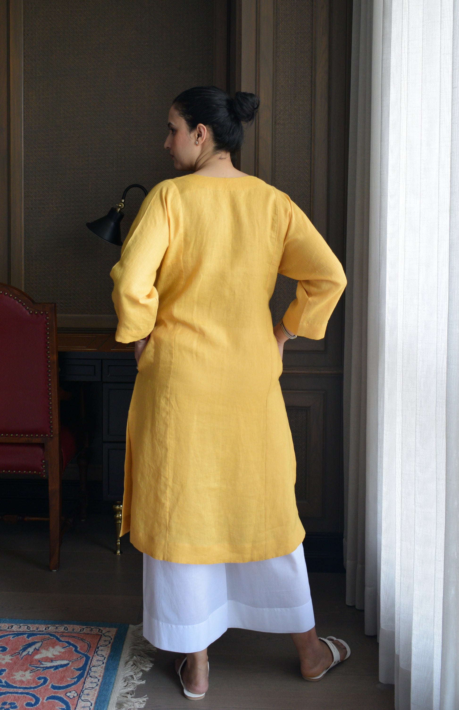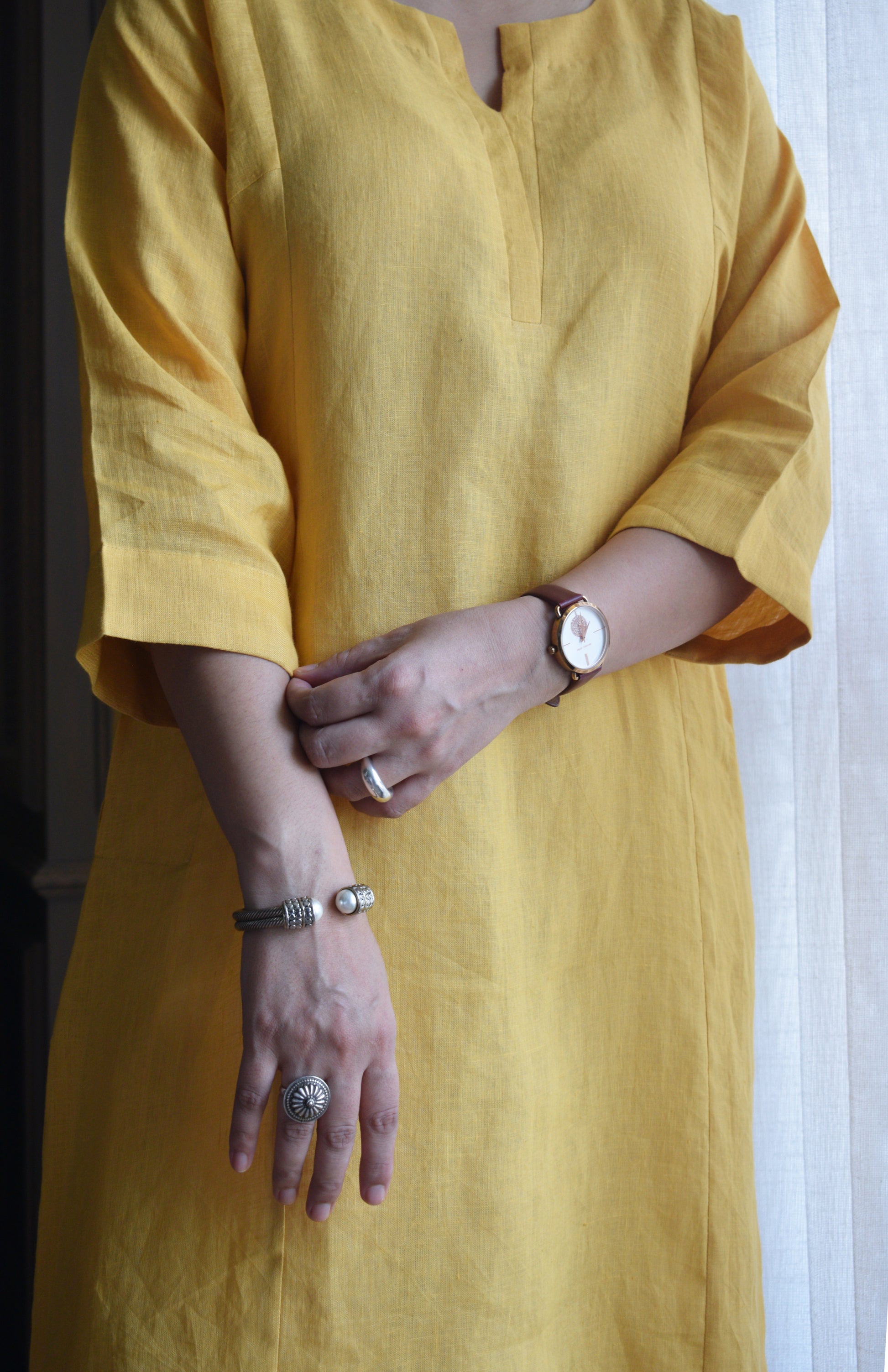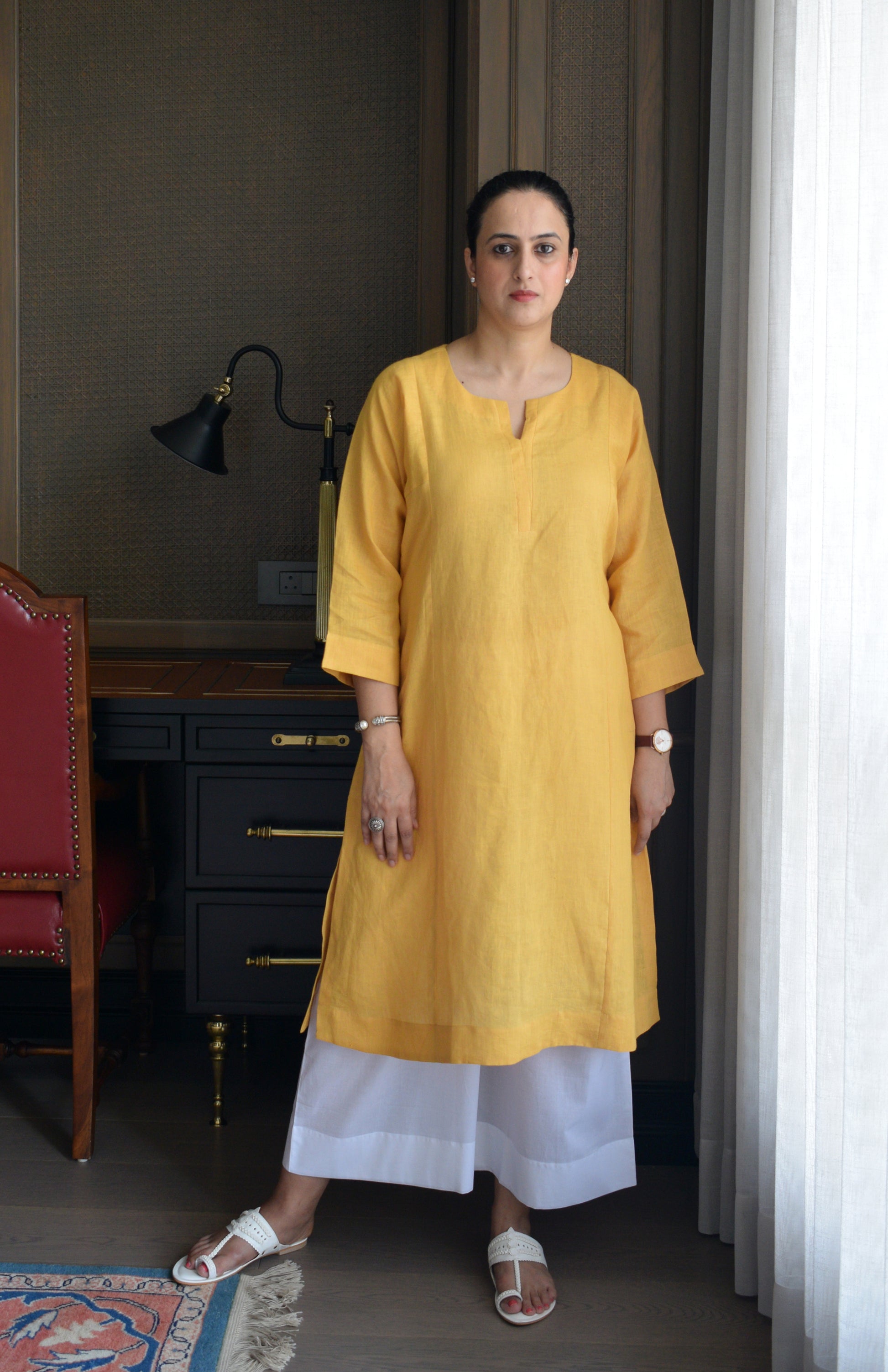 Our yellow linen straight fit paneled kurta can easily be styled with our sunkissed white basic pyjama or our multicolored striped linen pyjama for a semi formal look. You can keep the look minimalistic with a sleek watch and simple earrings.